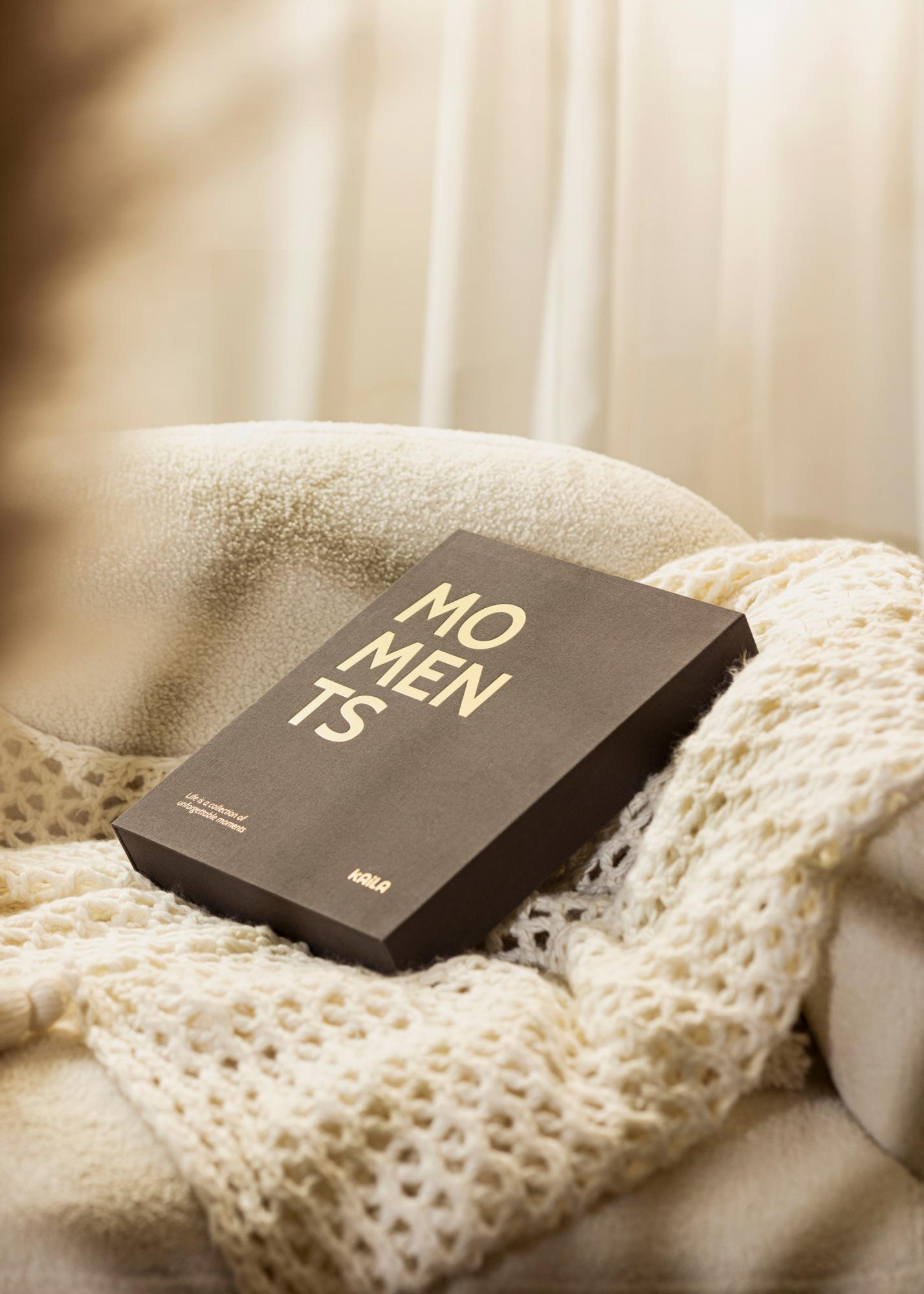 Das Fotoalbum in Form einer eleganten Box mit schwarzem Textileinband überzeugt durch seinen exklusiven, noblen Charakter. Vorderseite und Rücken werden mit dem schlichten Titel ”MOMENTS” dekorativ geschmückt. In der unteren Ecke links ziert zusätzlich der Untertitel ”Life is a collection of unforgettable moments” die Vorderseite dieses ansprechenden Fotoalbums.