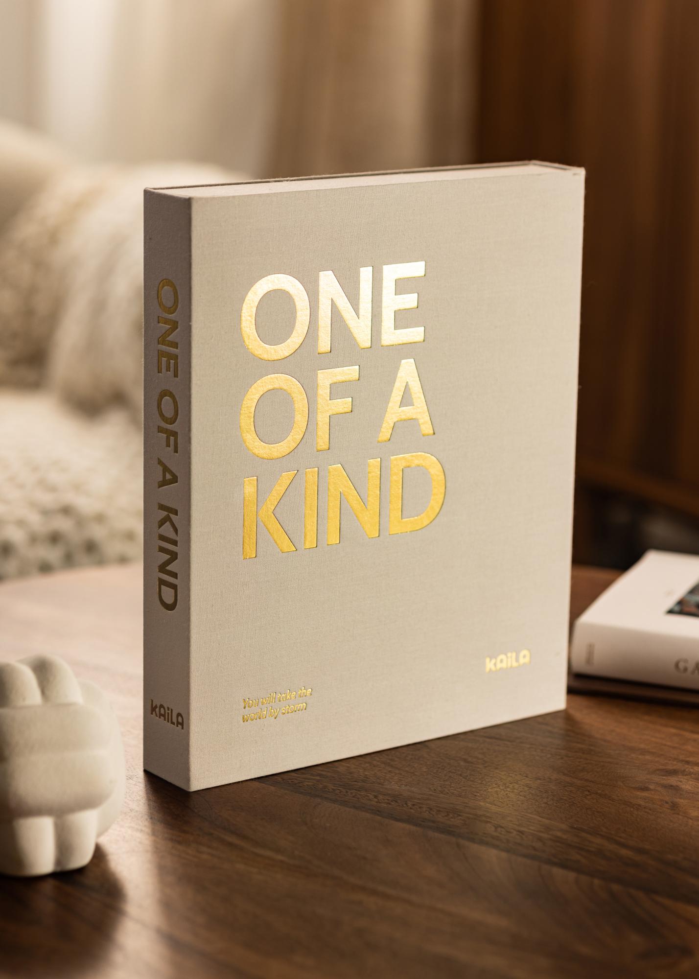 Fotoabzüge bestellen, Fotos entwickeln lassen und diese dann in einem wirklich schönen, stilvollen Coffee Table Photo Album aufbewahren. Dieses ansprechende Fotoalbum von KAILA eignet sich dafür ganz wunderbar. Das edle Fotoalbum mit Textileinband in hübschem Creme-Farbton ist als exklusive Box designt, was den ausgesuchten Charakter dieses Fotoalbums noch verstärkt. Dieses Album ist kein gewöhnliches Fotoalbum zum Einkleben, sondern zugleich ein hübsches Wohnaccessoire, das sich auch als Wohn-Deko sehen lassen kann. Der Einband des Fotoalbums trägt den Titel ”ONE OF A KIND”, gedruckt in weißen Großbuchstaben, sowie den Untertitel ”You will take the world by storm”. Damit ist es ein optimales Fotoalbum für Fotos schon aus früher Kindheit oder auch super geeignet als stilvolles, persönliches Fotogeschenk. Und natürlich ein optimaler Ort, deine eigenen Foto-Erinnerungen aufzubewahren.