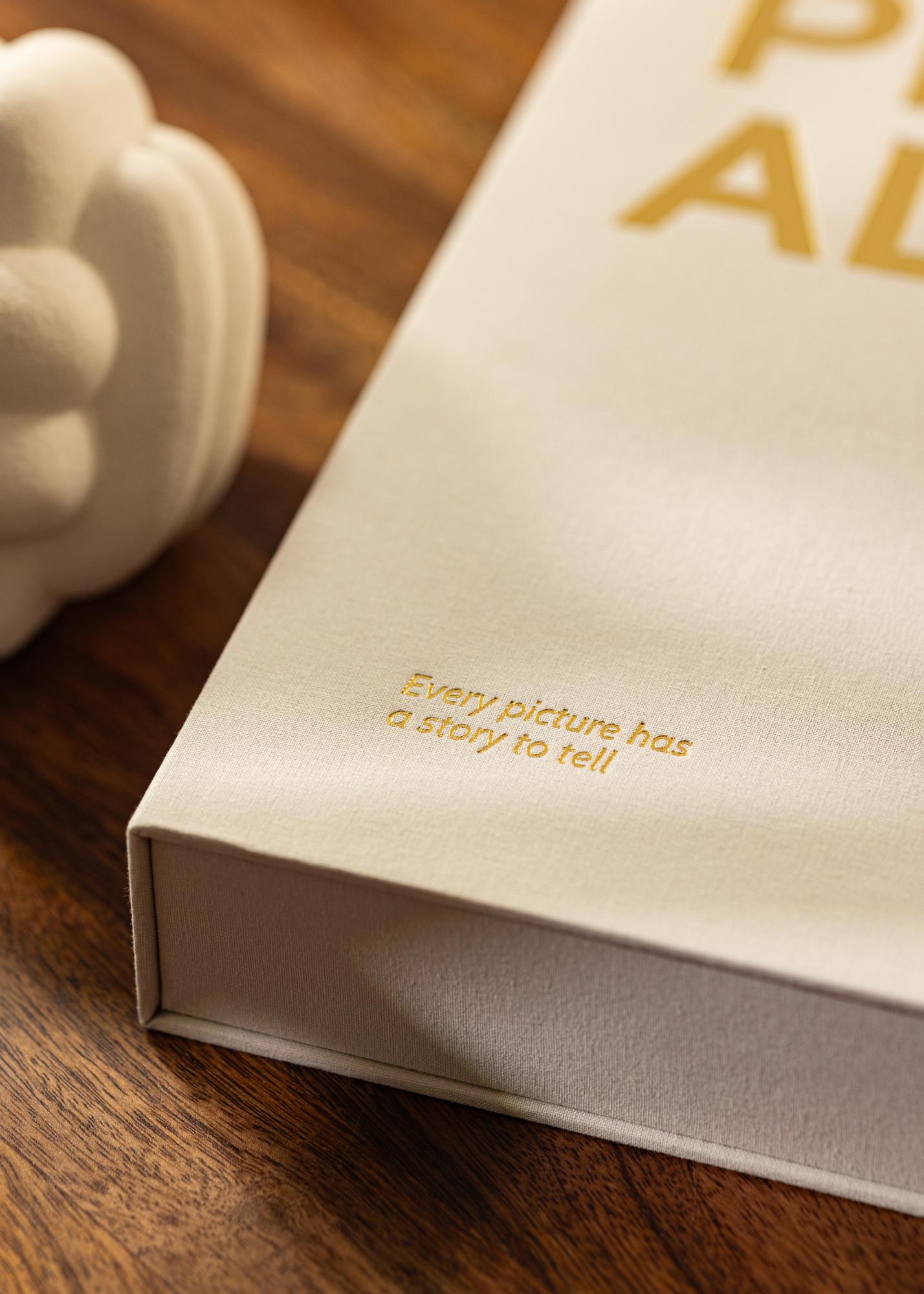 Dieses schöne Album ist genau das richtige Fotoalbum für alle, die einen stilvollen Aufbewahrungsort für ihre Fotos suchen und sich gleichzeitig über ein schickes Wohnaccessoire freuen, das die Einrichtung um einen kleinen, frischen und feinen Akzent bereichert. Dieses Fotoalbum ist wie ein Coffee Table Book designt und macht dank der edel wirkenden, modernen Formgebung ein hübsches Einrichtungsdetail aus, ob es nun auf dem Wohnzimmertisch, auf einer Kommode oder einem Regal platziert wird. Das Album besteht aus einer exklusiven Box mit cremefarbenem Textileinband. Wird das Album, die Box, geöffnet, erwarten dich ein Ringbuch sowie 60 schwarze Albumseiten (30 Blatt), die mit Fotos beklebt werden wollen. In diesem trendigen Einklebealbum kannst du die Fotos nach Belieben anordnen und einkleben.