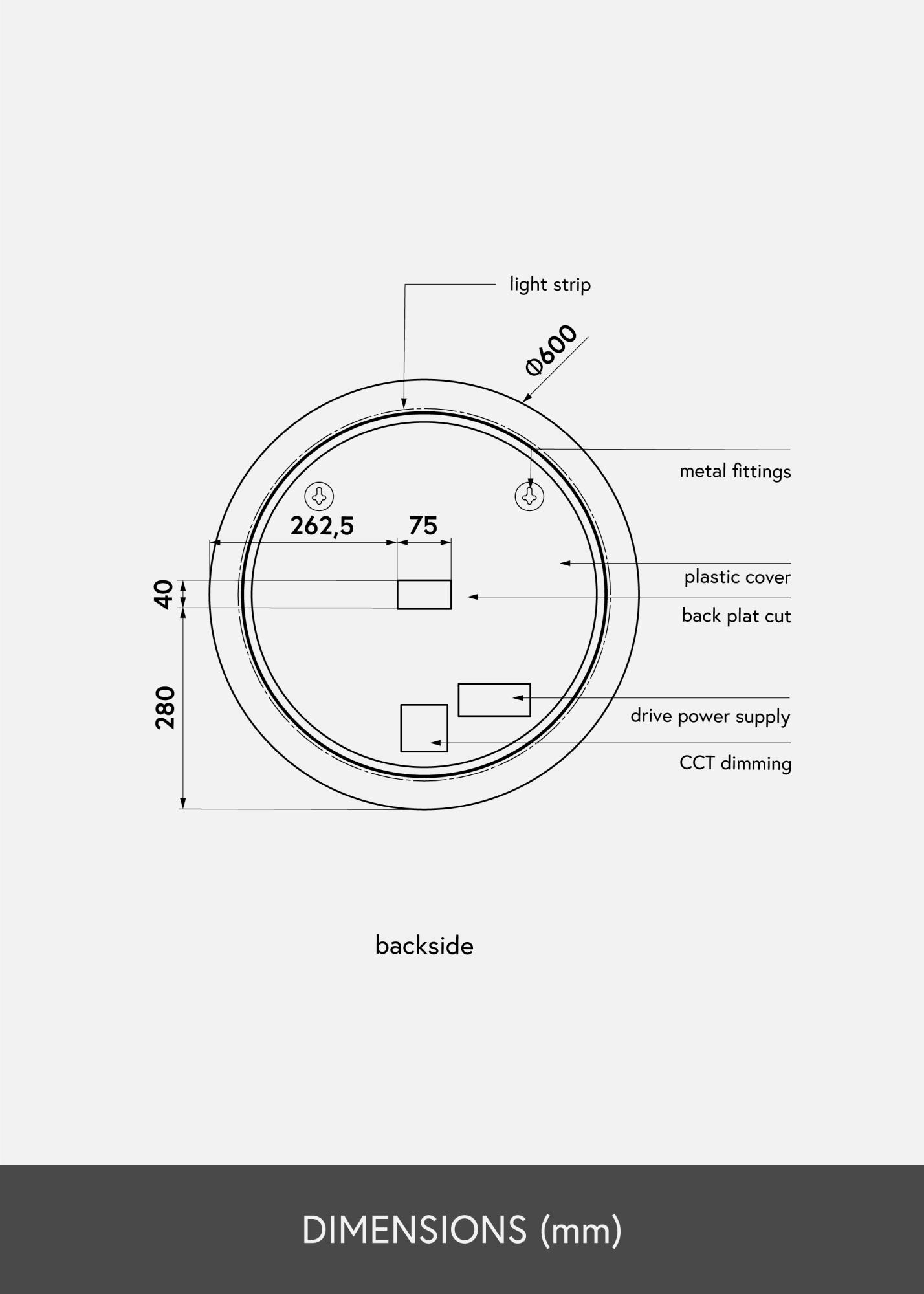 Selbstverständlich ist dieser Spiegel für die Verwendung in Badezimmern geeignet, kann aber auch genausogut in anderen Räumen verwendet werden. Die schöne, elegante Formgebung passt in nahezu jedes Wohnambiente. Der Spiegel besitzt einen Durchmesser von 60 cm und eine Tiefe von 3 cm. Außerdem ist dieser Badspiegel mit Wandhalterungen versehen. Der Spiegel ist für feste Installation vorgesehen und muss an einen Stromschalter angeschlossen werden. Damit der Spiegel ordnungsgemäß und korrekt funktioniert, muss er an einen normalen Schalter angeschlossen werden, nicht an einen Dimmschalter.