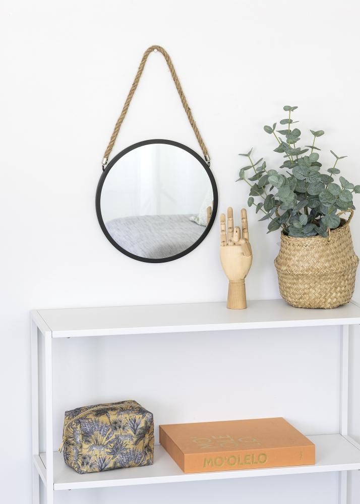 Toller runder Wandspiegel mit maritim anmutender Seil-Aufhängung. Der Wandspiegel ist aus Metall gefertigt und mit einem dekorativen Hanfseil als stilvolle Aufhängung versehen. Die schwarze, schlichte Einrahmung des Spiegelglases wirkt zeitlos elegant. Der Deko-Spiegel misst 30 cm im Durchmesser.