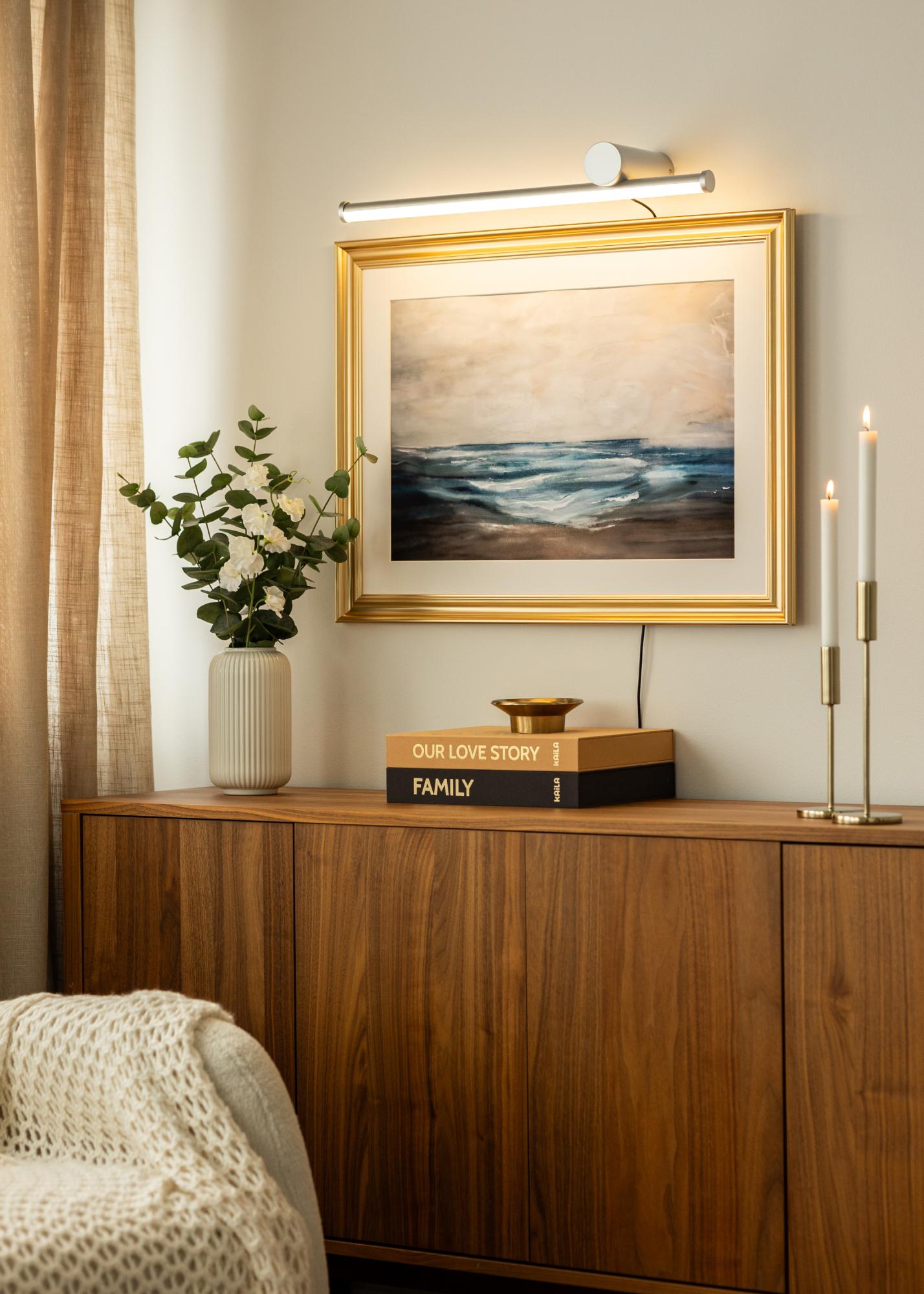 Die Beleuchtung ist mit einer LED-Lichtquelle ausgestattet, die ein warmweißes Licht von 3000K abgibt. Dieses Licht ist angenehm und schafft eine weiche und einladende Atmosphäre im Raum, ohne zu stark zu sein. Die Lichtstärke beträgt 780 Lumen, was ausreichend Licht bietet, um die Details Ihrer Kunst hervorzuheben, ohne überwältigend zu wirken. Das Licht wird gleichmäßig verteilt, sodass jeder Teil des Bildes deutlich sichtbar ist.