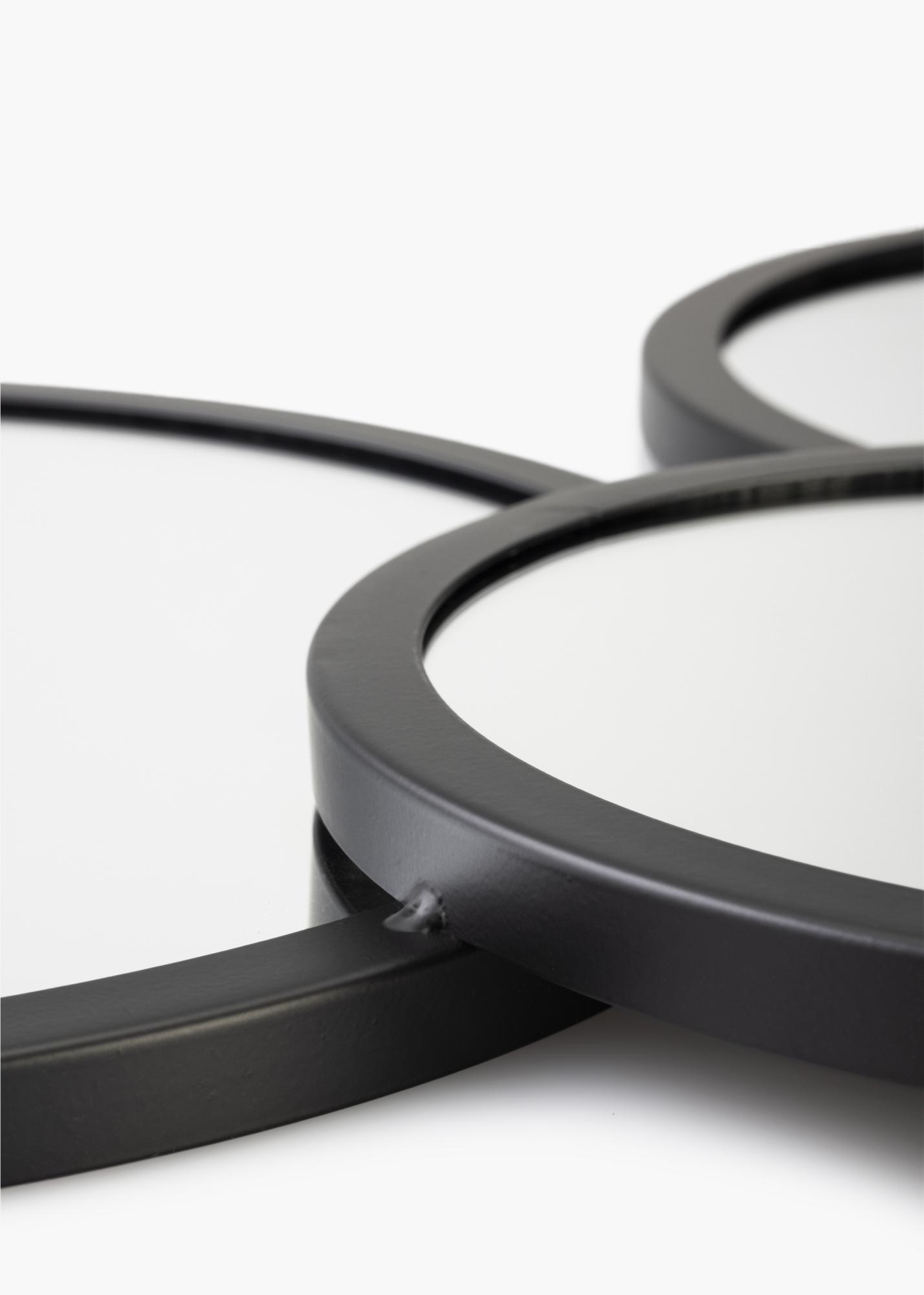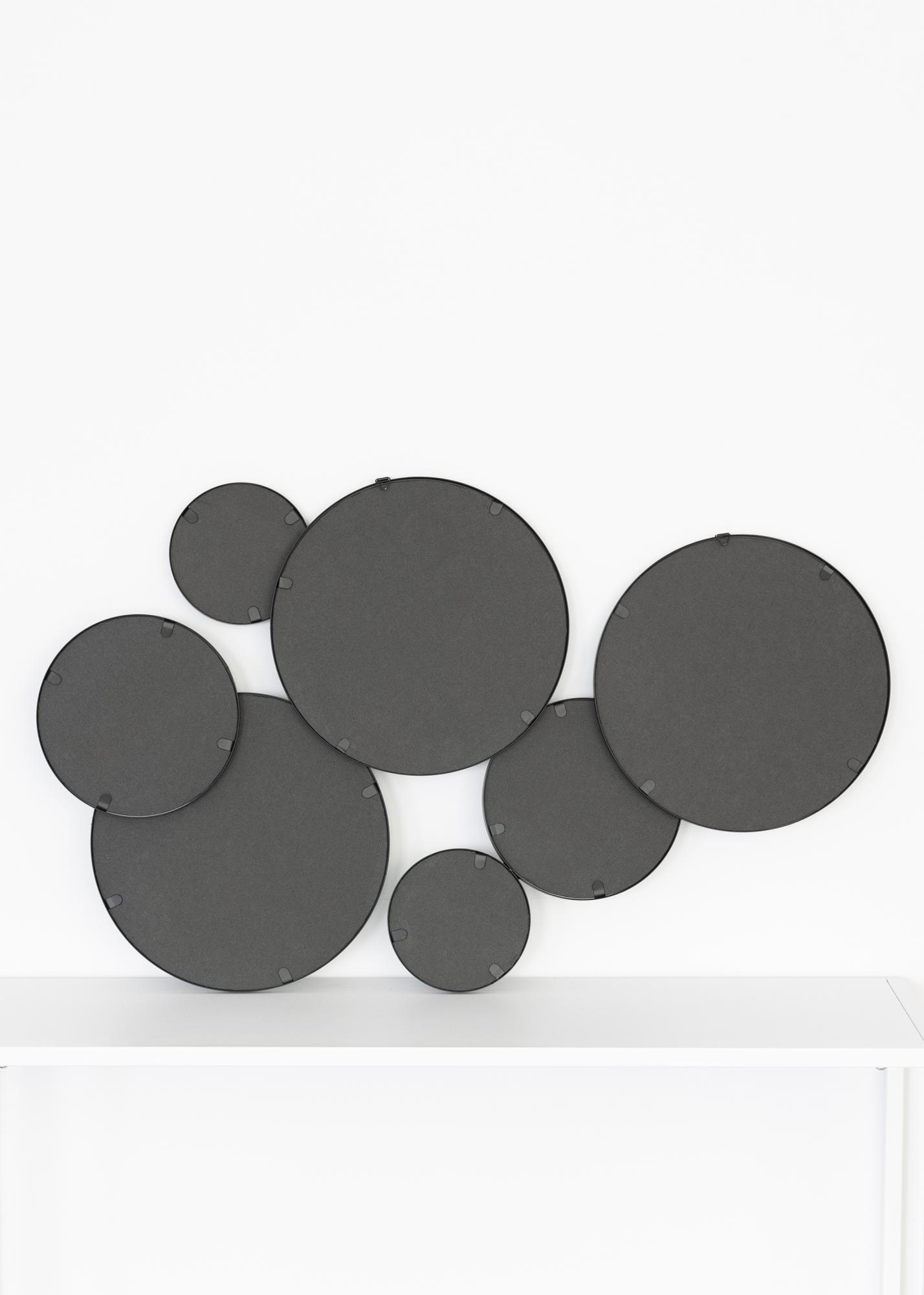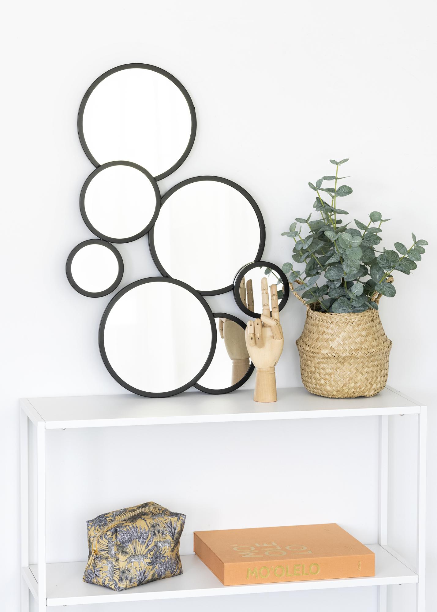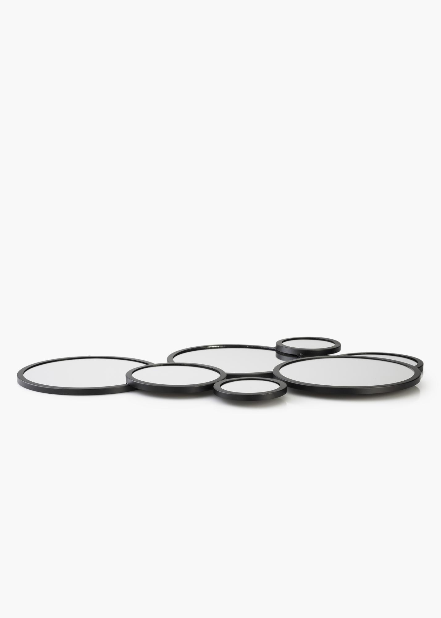 Die Spiegelkombination Bubbles ist ein toller Dekospiegel in außergewöhnlichem Design, der aus mehreren, unterschiedlich großen, kreisrunden Spiegeln besteht, die zusammen ein ansprechendes Gesamtbild ergeben. Der Spiegel hat die Größe 72x43 cm und besitzt eine stilvolle schwarze Kante. Dieser wirklich attraktive Deskospiegel ist mit Wandhalterungen für die Aufhängung im Querformat ausgestattet, er kann aber auch hochkant an die Wand gelehnt aufgestellt werden. Der Spiegel ist aus Metall gefertigt.