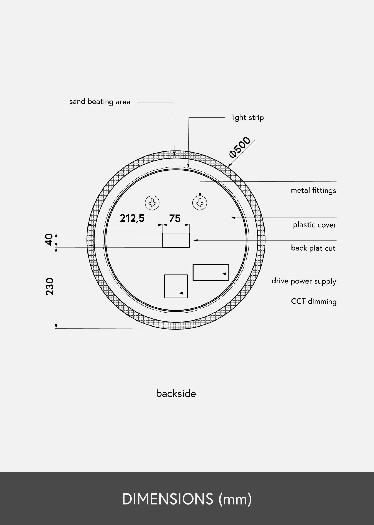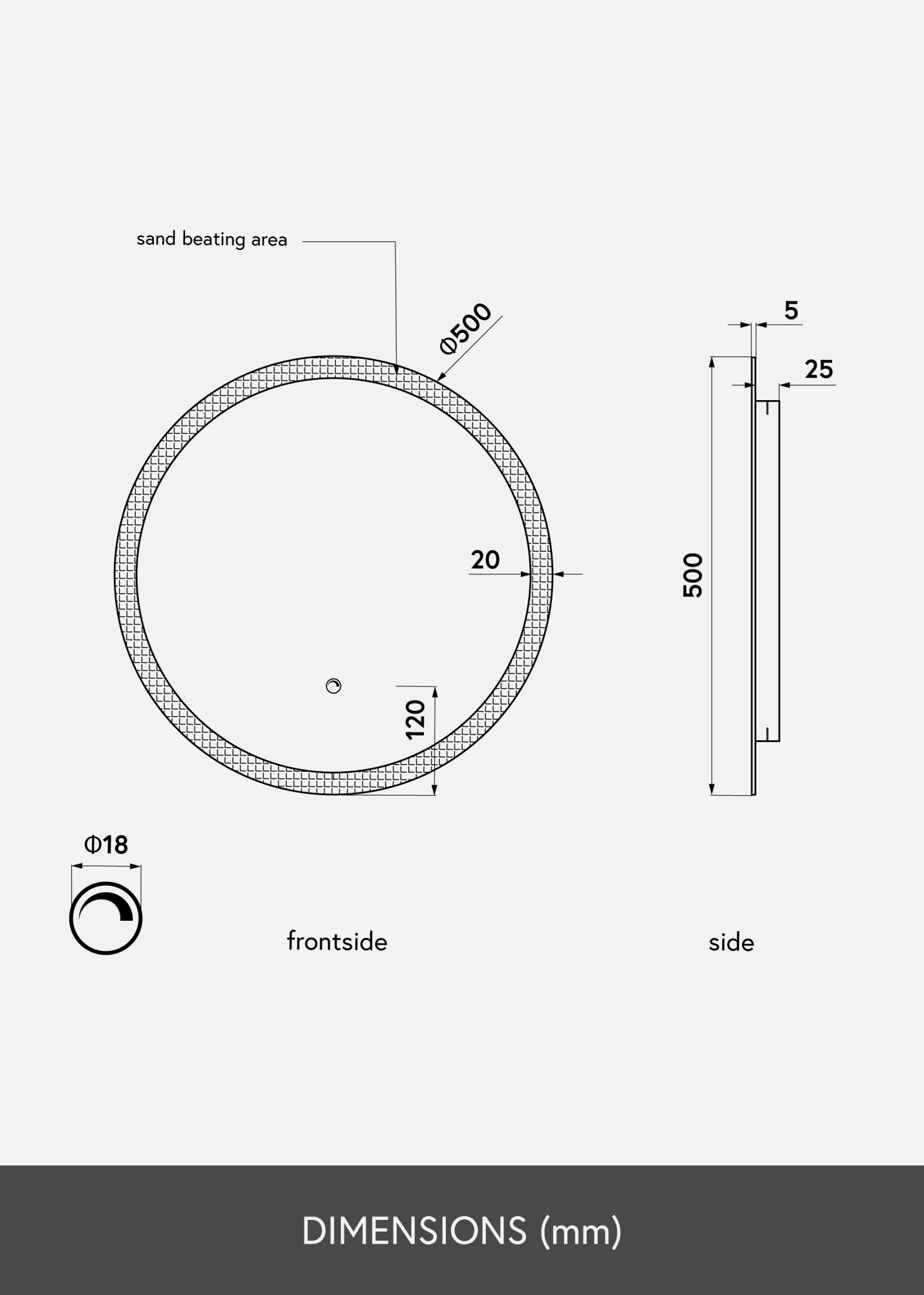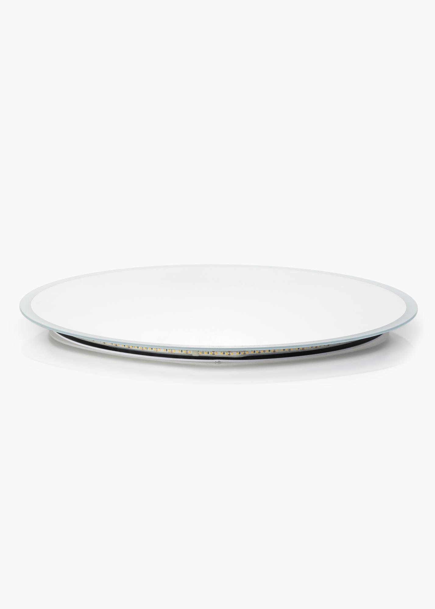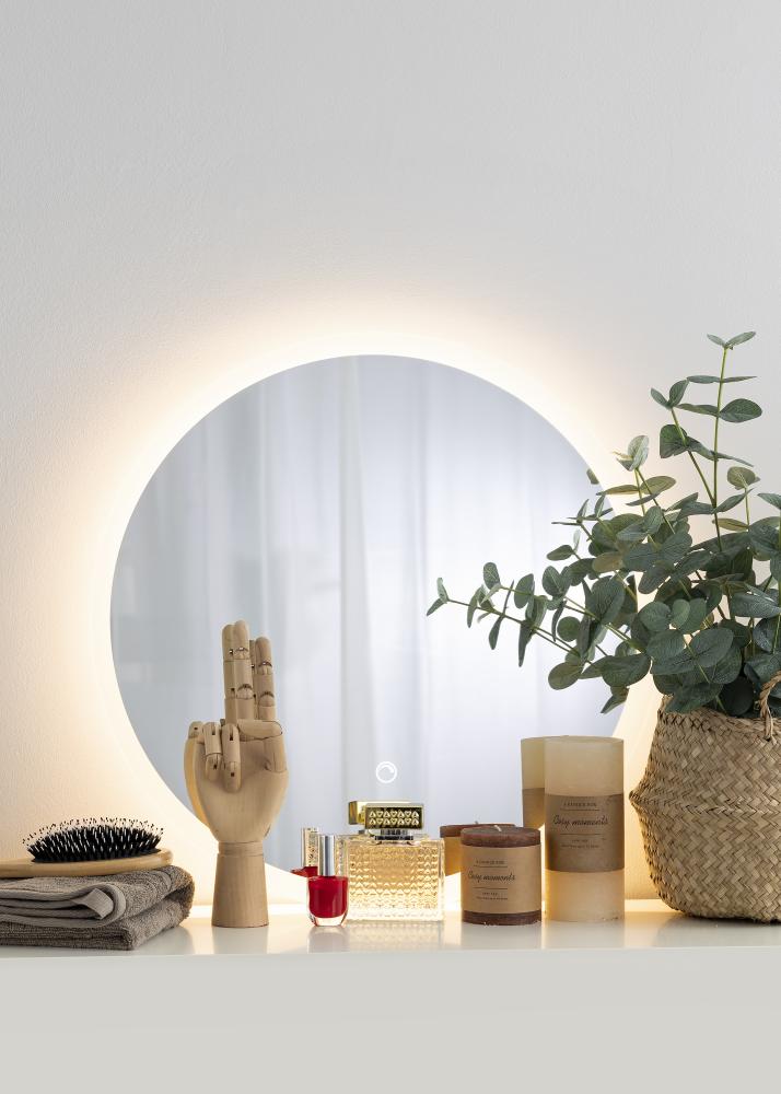 Klassischer, runder Badspiegel, formschön und elegant. Der Spiegel wird von einem gefrosteten Rand mit integrierter LED-Beleuchtung dekorativ umrahmt. Die LED-Beleuchtung ist dimmbar und kann einfach durch Gedrückthalten des wasserdichten Touch-Sensors für einige Sekunden lang eingestellt werden. Der angenehm warmweiße Lichtschein von 3000 K beleuchtet den Spiegel mit einem nach vorne hin strahlenden Lichtschein. Die letzte Einstellung wird beim erneuten Einschalten der Beleuchtung beibehalten. Dieser Spiegel ist mit Wandhalterungen versehen und für die Verwendung in Badezimmern geeignet. Der Spiegel ist für feste Installation vorgesehen und muss an einen Stromschalter angeschlossen werden. Damit der Spiegel ordnungsgemäß und korrekt funktioniert, muss er an einen normalen Schalter angeschlossen werden, nicht an einen Dimmschalter.