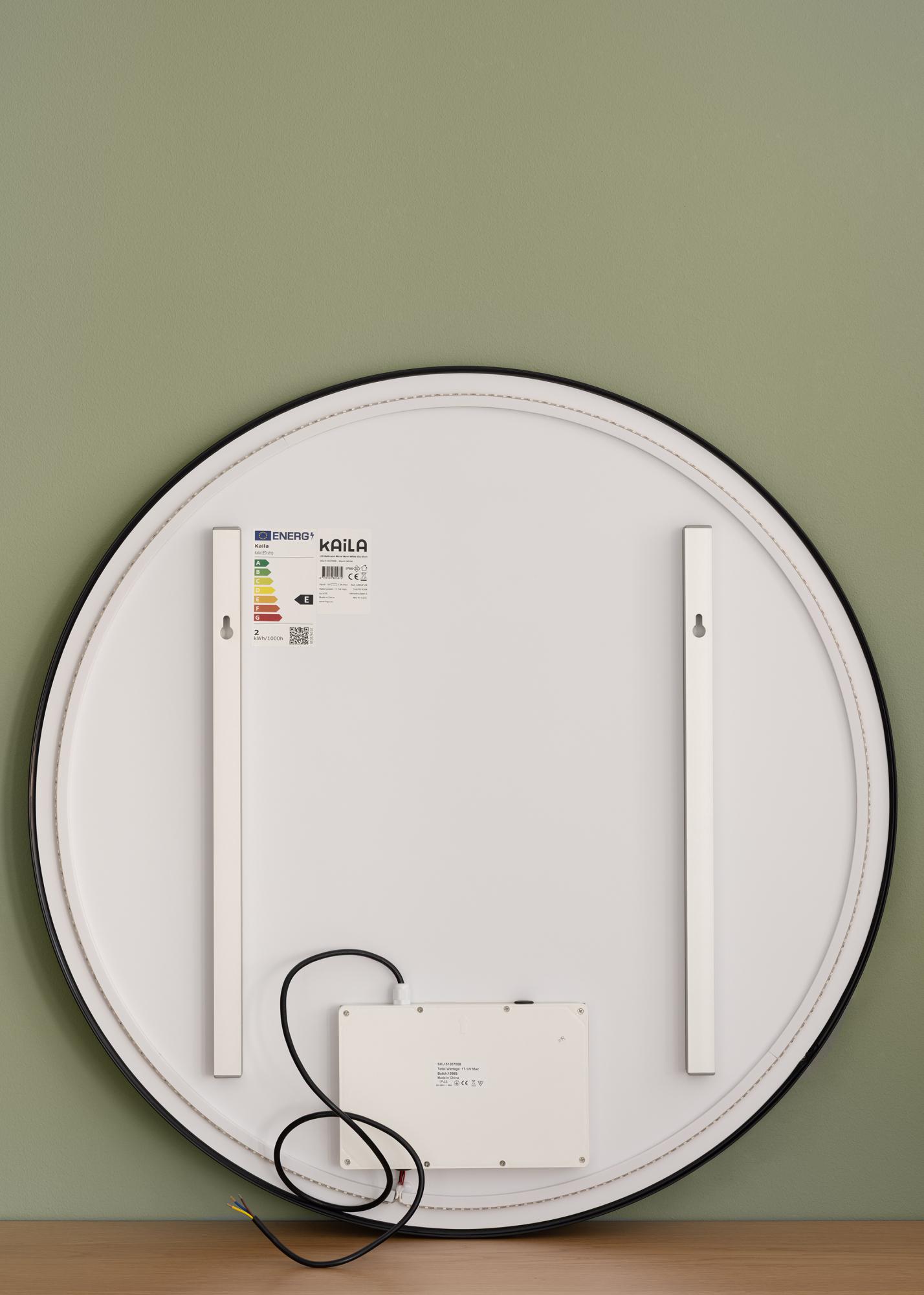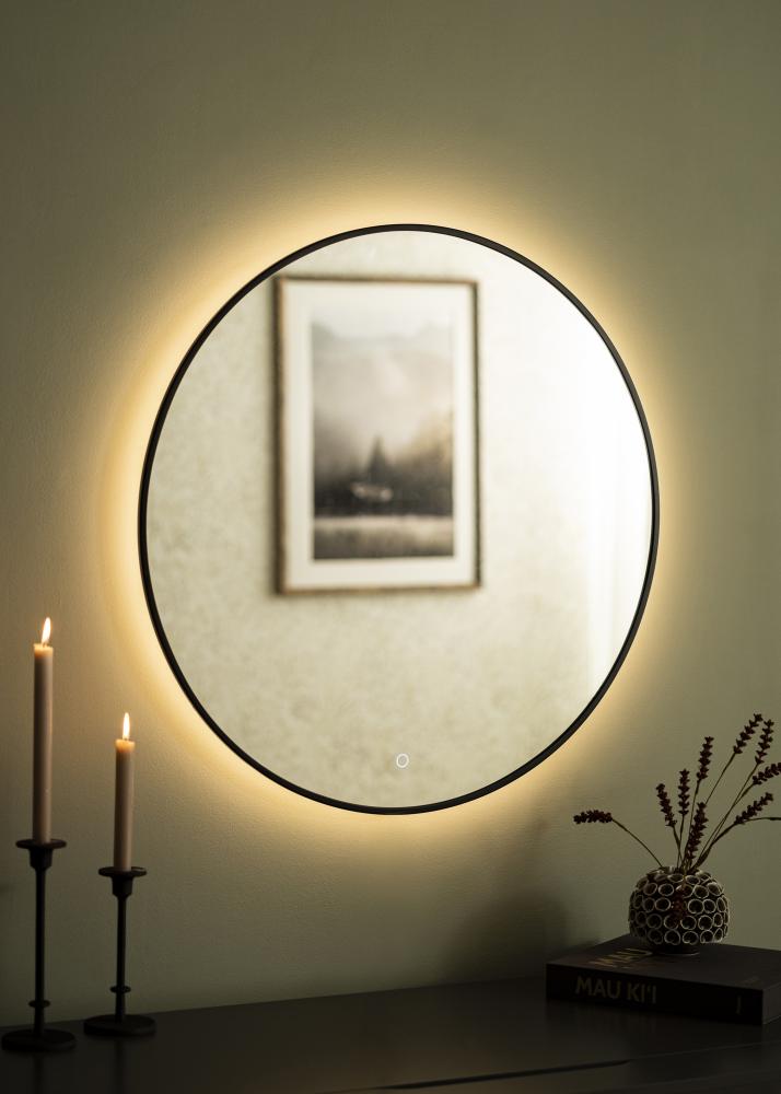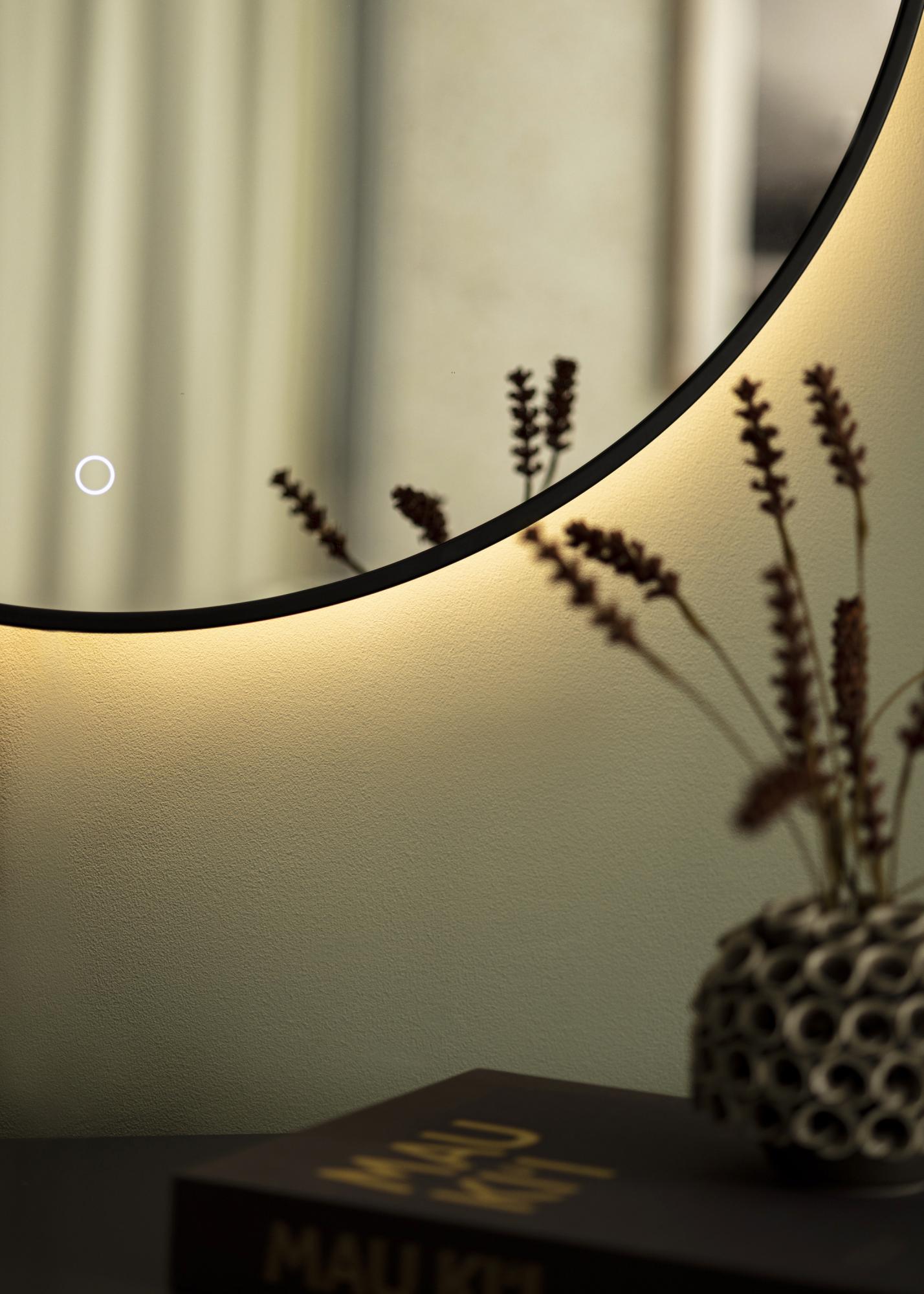 Ein stilvoller Spiegel mit LED-Beleuchtung, der als Flurspiegel im Eingangsbereich genauso gut aussieht wie als Badezimmerspiegel. Der Spiegel besitzt eine klassisch runde Form und einen stilsicher schwarzen Metallrahmen. Die integrierte LED-Beleuchtung des Spiegels mit der Lichtfarbe von 3000 K kann gedimmt und damit die Lichtstärke zwischen 10%-100% eingestellt werden. So kannst du die Beleuchtung ganz nach Belieben und Bedarf einstellen und je nach Situation ändern wann immer du willst. Soll das Licht gedimmt werden, einfach die Touch-Taste im unteren Bereich der Spiegelfläche einige Sekunden lang drücken. Die LED-Beleuchtung des Spiegels befindet sich an der Rückseite der Spiegelkante, wodurch die Beleuchtung einen weicheren Charakter mit stimmungsvollerem Lichtschein erhält.