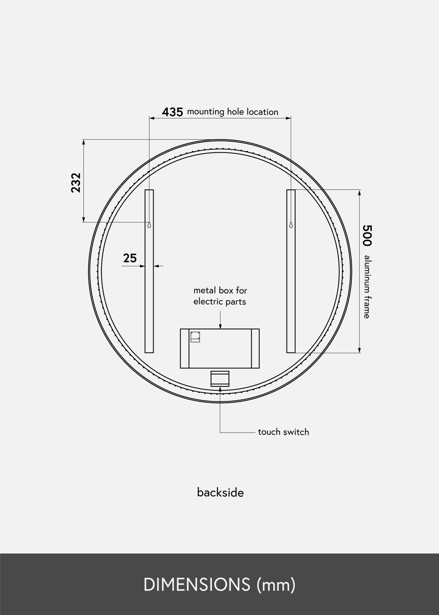 Der runde Wandspiegel hat einen Durchmesser von 78,5 cm. Dieser Spiegel ist für die feste Installation vorgesehen und wird an einen Stromschalter angeschlossen. Damit der Spiegel ordnungsgemäß und korrekt funktioniert, muss der Spiegel an einen normalen Stromschalter angeschlossen werden, nicht an einen Dimmer.