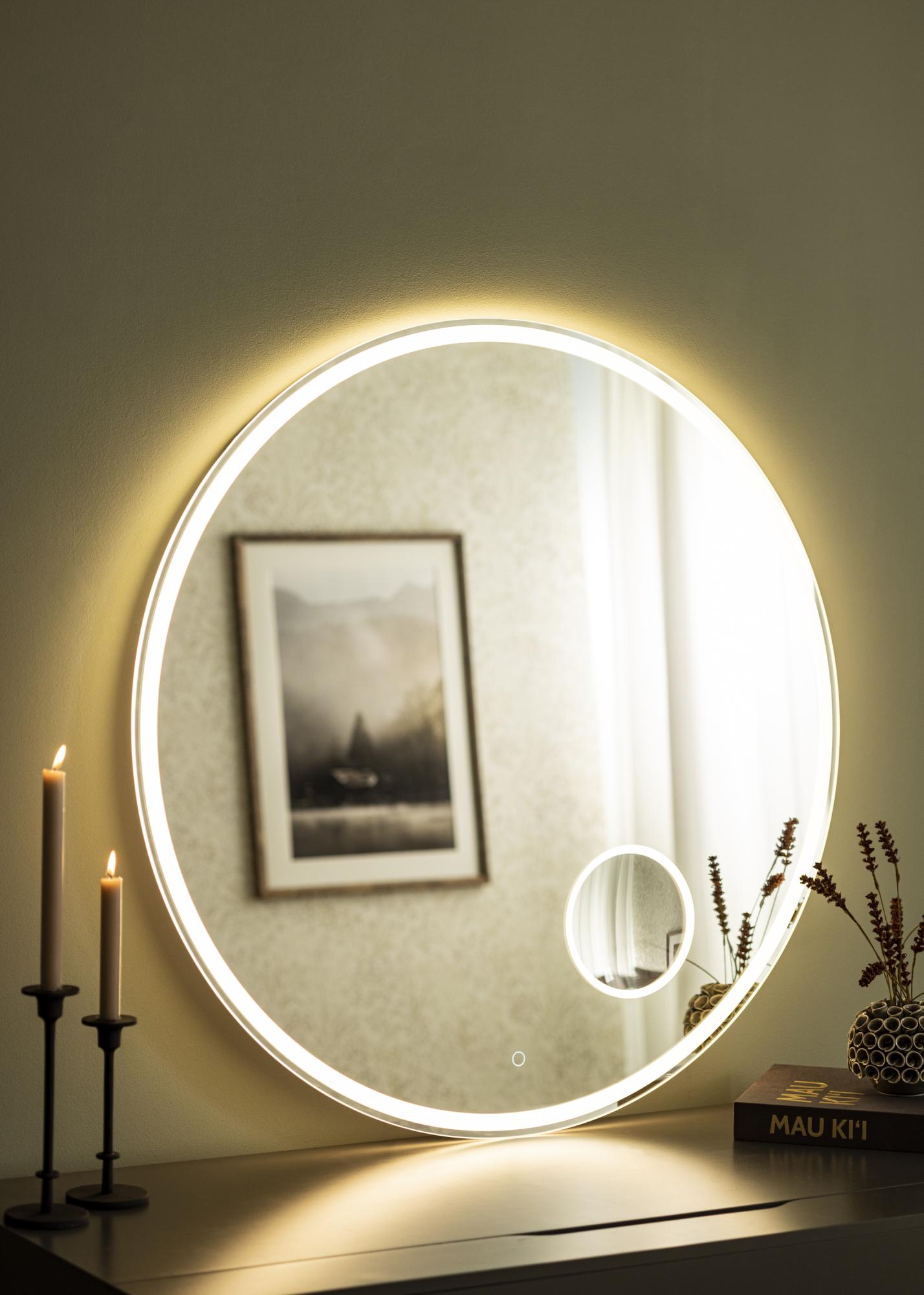 Bist du auf der Suche nach einem stilechten Badspiegel mit integrierter LED-Beleuchtung und Vergrößerungsfunktion? Dann ist das genau der richtige Badspiegel für dich! Der Spiegel überzeugt durch seine klassisch runde Form und das integrierte LED-Band, das nah an der Spiegelkante rund um die Spiegelfläche verläuft und diese hübsch einrahmt. Der Spiegel ist mit normalem Spiegelglas und einem kleineren Spiegel mit 3-fach Vergrößerung ausgestattet, der auch mit einer umlaufenden LED-Beleuchtung ausgestattet ist. Das Licht leuchtet in einer angenehmen Farbtemperatur von 3000 K und die Lichtstärke kann einfach zwischen 10-100% eingestellt werden. Zum Einstellen der Lichtstärke wird die Touch-Taste im unteren Bereich der Spiegelfläche einige Sekunden lang gedrückt.