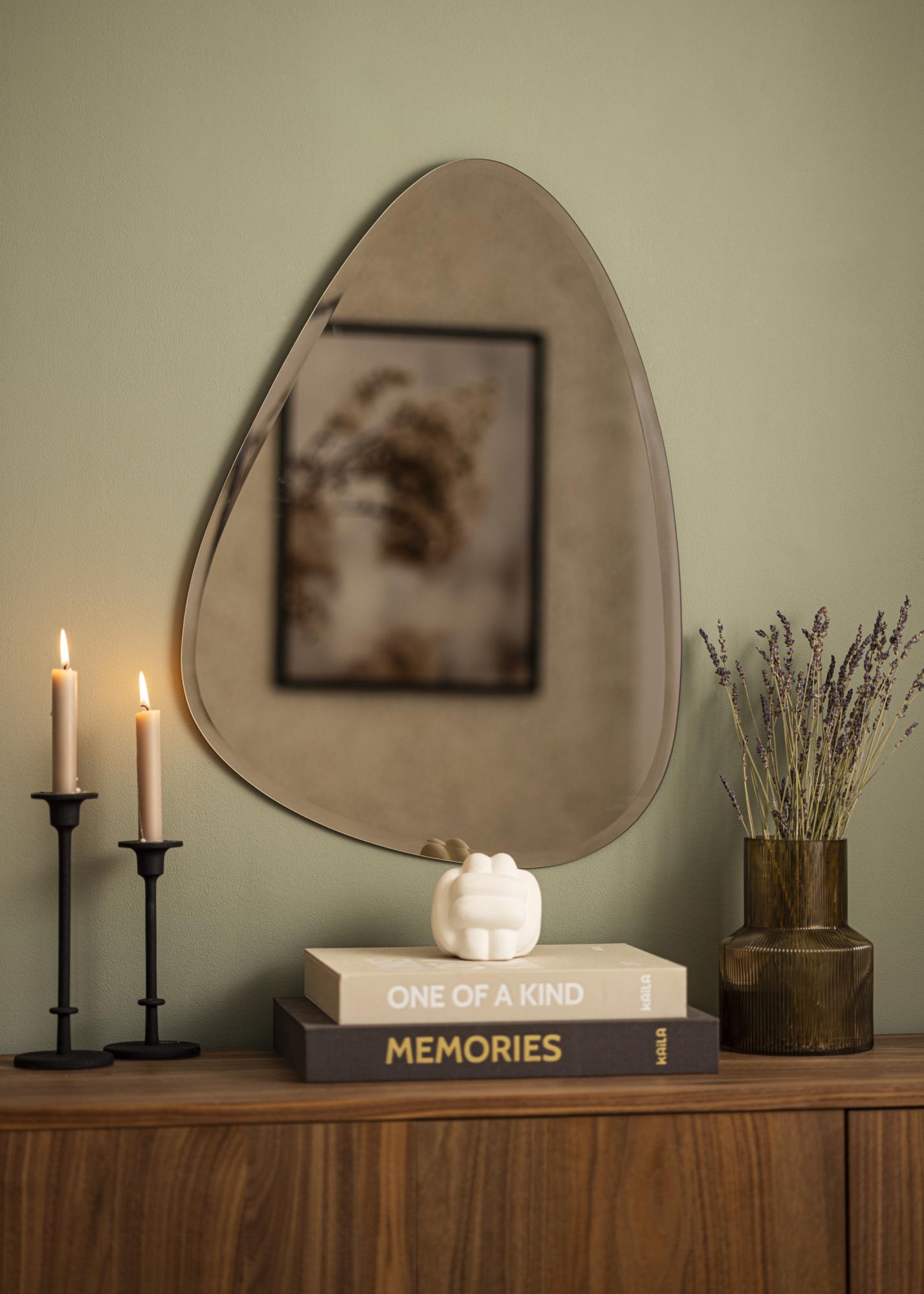 Dieser asymmetrische Wandspiegel von KAILA zeichnet sich durch das trendige, getönte, bronzefarbene Spiegelglas aus. Ein Spiegel mit einem etwas dunkleren Spiegelglas macht einen besonderen Blickfang aus und passt wunderbar zu modern eingerichteten Räumen und zu jungen, unkonventionellen, individuellen Wohn- und Einrichtungsstilen. Der Spiegel besitzt eine geringe Dicke und kommt aufgrund der eleganten Kante mit Facettenschliff ohne Rahmen aus, was den stilvollen Charakter dieses Spiegels einmal mehr verstärkt.