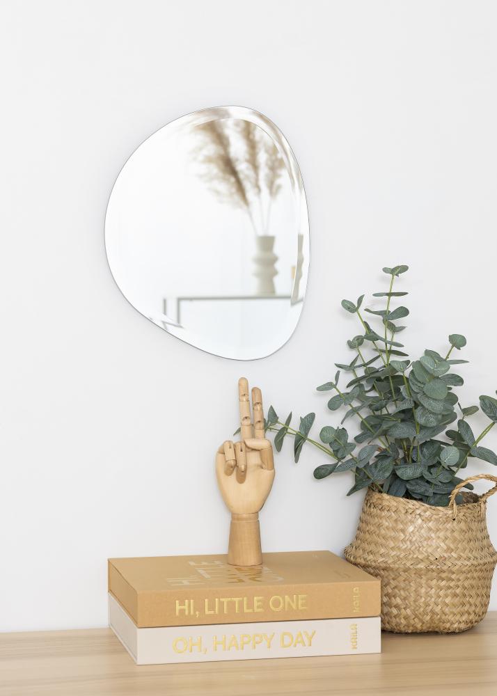 Dieser Wandspiegel von KAILA hat eine elegante asymmetrische Form, die an einen Tropfen erinnert. Der Spiegel ist sehr dünn und hat keinen Rahmen, was in Kombination mit einem luxuriös facettierten Rand seine elegante und moderne Optik noch verstärkt. Er ist ein äußert dekorativer Wandspiegel, der in jedem Raum, in dem er angebracht wird, garantiert alle Blicke auf sich zieht - im Wohnzimmer ebenso wie im Flur oder Schlafzimmer. Der Spiegel hat eine Größe von 30 × 35 cm.