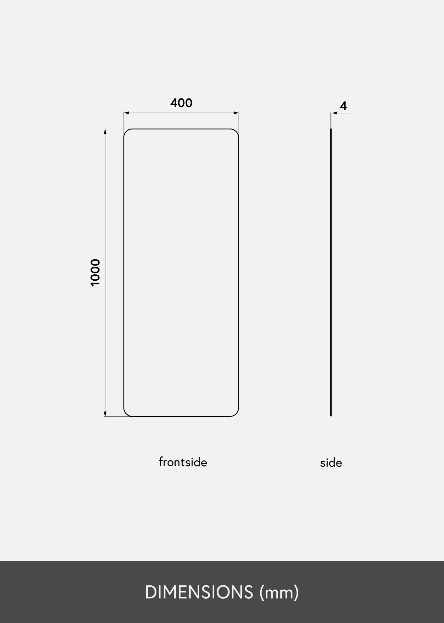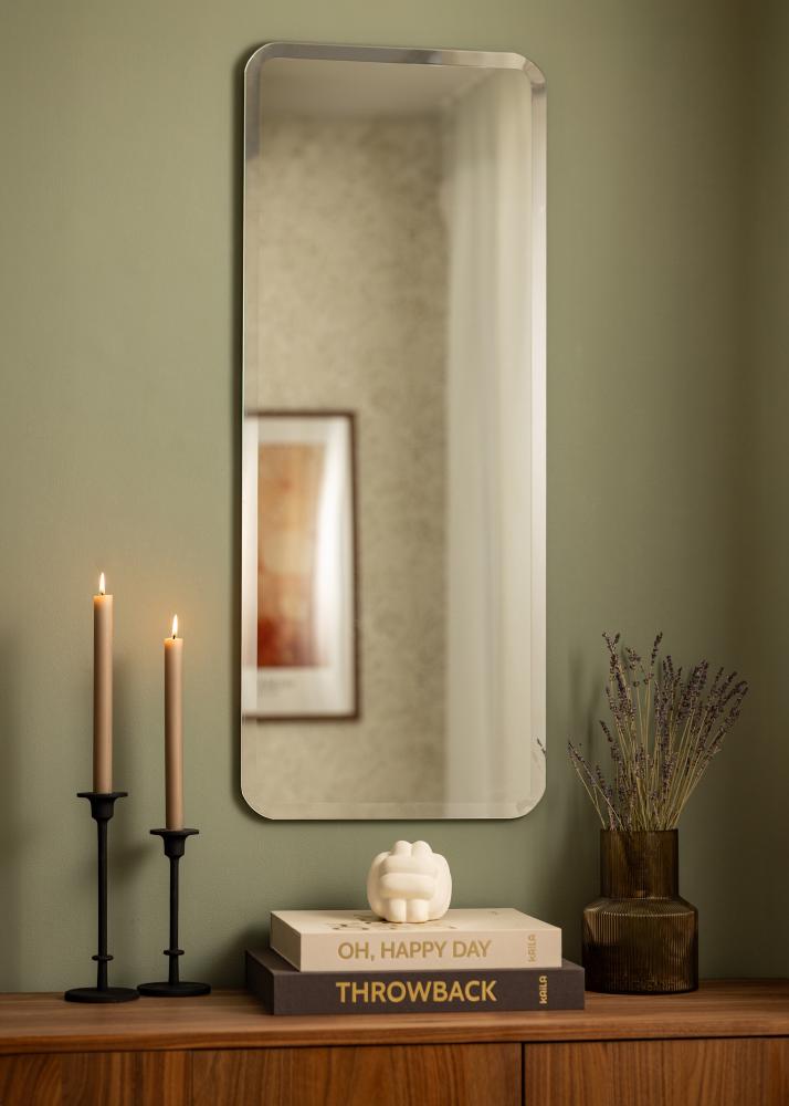Dies ist ein rechteckiger Spiegel von KAILA mit dekorativen abgerundeten Ecken. Seine weiche Form verleiht dem Spiegel eine elegante Optik, die dadurch verstärkt wird, dass er keinen Rahmen besitzt. Der Spiegel hat eine Größe von 40 × 100 cm und verfügt über einen wunderschön facettierten Rand.