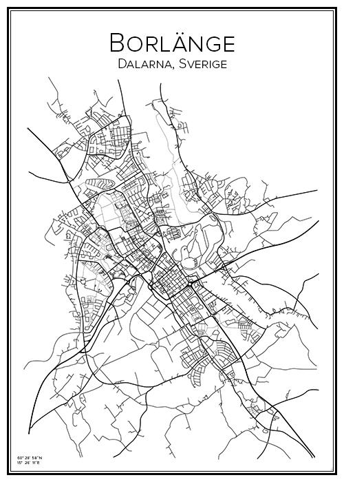 Poster mit einer schlichten Straßenkarte von Borlänge, der größten Stadt in der mittelschwedischen Region Dalarna. Die Stadt, die Ende des 19. Jahrhunderts rund um die Eisenbahnschienen und Industrie wuchs, erhielt nie einen einheitlichen Stadtplan und wird heute von Verkehrsrouten aufgeteilt, die durch die Stadt verlaufen. Die Karte ist ein minimalistischer, grafischer Druck, der gut zu einem Bilderrahmen in Schwarz oder Weiß passt, der das Motiv hervorhebt. Die Karte kann aber auch mit allen anderen Rahmen für Poster kombiniert werden.