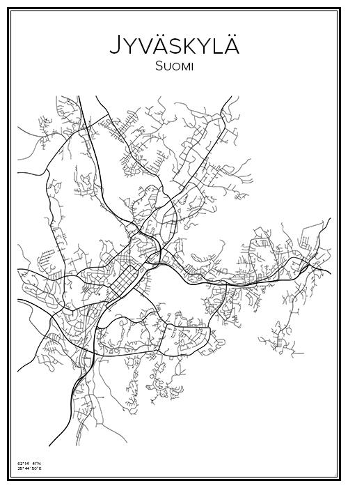 Poster mit einer stilisierten Karte vom Straßennetz der finnischen Stadt Jyväskylä, einem wichtigen Verkehrsknotenpunkt. Die Teile des Stadtzentrums, das für finnische Verhältnisse ungewöhnlich dicht besiedelt ist, bilden ein schmuckes Routennetz aus Wegen. Der grafische Druck der Karte, zusammen mit dem Ortsnamen und den Koordinaten, bildet ein schlichtes Poster, das in alle Einrichtungsstile passt und mit Hilfe eines entsprechenden Bilderrahmens ganz leicht an die Einrichtung angepasst werden kann.