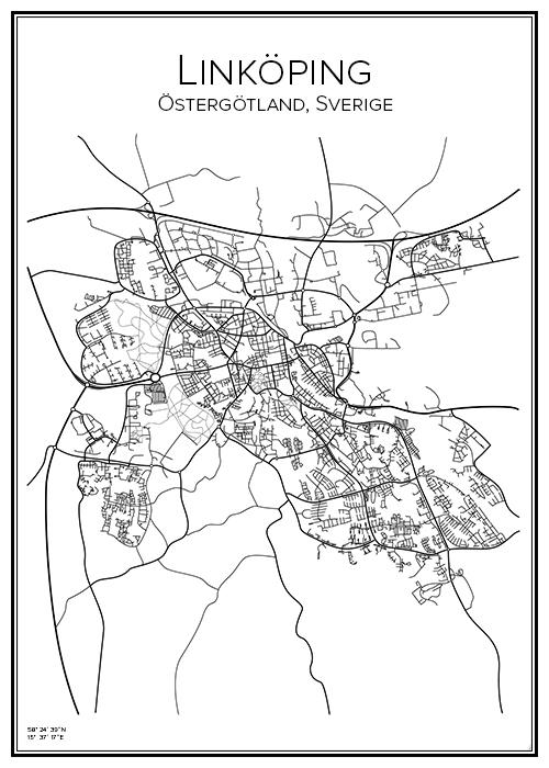 Poster mit Karte, die das Straßennetz Linköpings zeigt, der Wiege der Luftfahrt. Das grafische Kartenmotiv mit seinem schwarzen Druck auf weißem Hintergrund gibt in jeden Raum Ihres Zuhauses eine schicke Figur ab und ist ein gutes Geschenk für jeden, der eine Verbindung zur Stadt hat. Rahmen Sie das Poster in einen Bilderrahmen, der zu Ihrer Einrichtung passt und kombinieren Sie es mit anderen Bildern mit ähnlichem Thema.