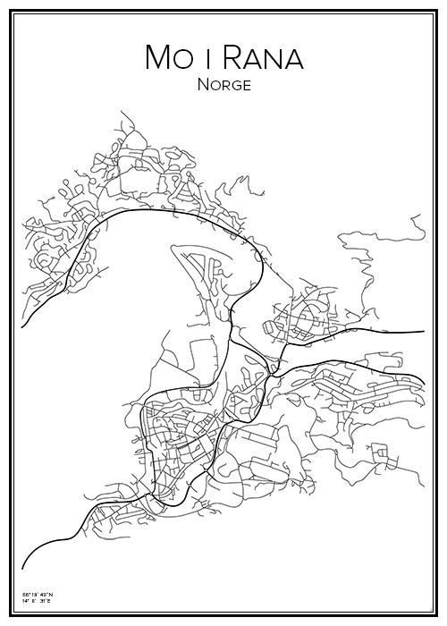 Poster mit einer stilisierten Karte von der norwegischen Stadt Mo in Rana, Zuhause des Arctic Circle Raceway, Norwegens größter Rennstrecke. Durch das grafisch-pure Design passt das Poster in jede Umgebung und lässt sich leicht auf die übrige Einrichtung abstimmen, indem sie es mit einem entsprechenden Bilderrahmen kombinieren. Das Bild ist ein ausgezeichnetes Geschenk für alle diejenigen, die eine Verbindung zur Stadt haben oder am Motorsport interessiert sind.