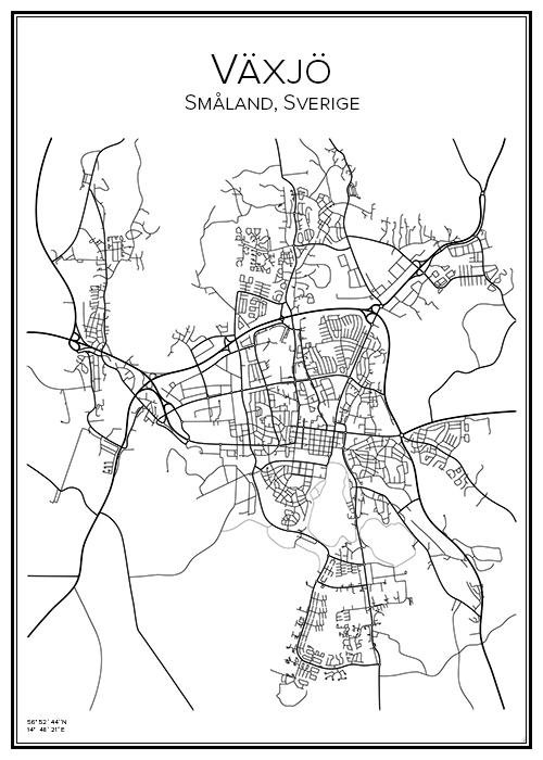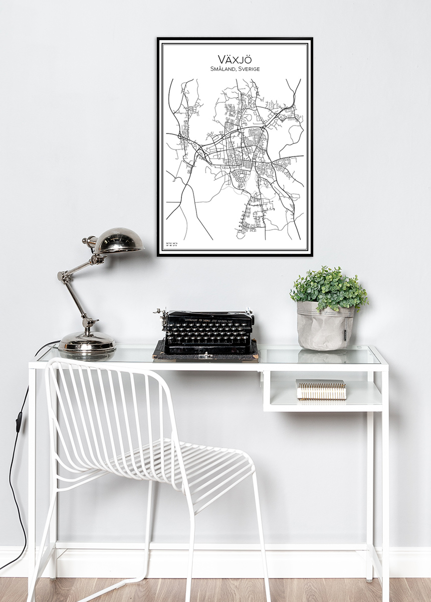 Schwarz-Weiß-Poster mit der Karte von Växjö, Schwedens grünster Stadt. Die Stadt zwischen den Seen wird mit stilisiertem Straßennetz dargestellt, und dieser schlichte Druck passt gut zu diversen Einrichtungsstilen. Kombinieren Sie das Plakat mit einem Bilderrahmen, der zu Ihrer Einrichtung passt.