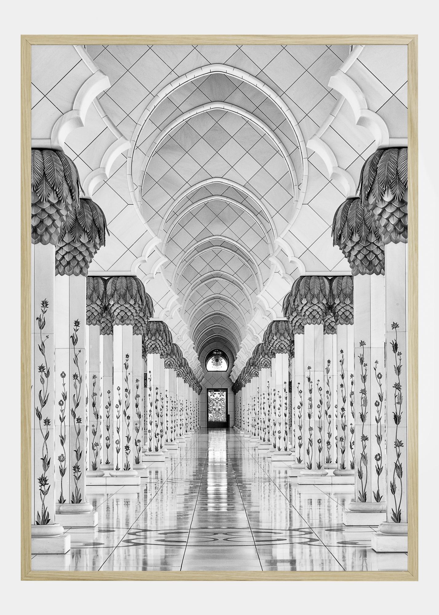 Ein schwarz-weißer Illustrationsdruck mit Tiefgang. Zwei Reihen von Säulen führen zu einer Glastür in der Ferne. Die Säulen sind wunderschön mit Blumen geschmückt. Das natürliche Licht scheint durch die Glastür herein und erzeugt eine Lichtreflexion auf dem Boden. Hängen Sie dieses Bild auf, um ein Gefühl von Weite zu schaffen.