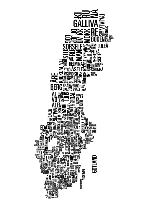 Lerne die Namen aller Gemeinden Schwedens mit Hilfe dieser kreativen Schwedenkarte! Das schwarz-weiße Poster stellt eine Karte von Schweden dar, die ausschließlich aus Text besteht. Der Text zeichnet auf sehr elegante Weise nach, wo im Land die jeweilige Gemeinde liegt.