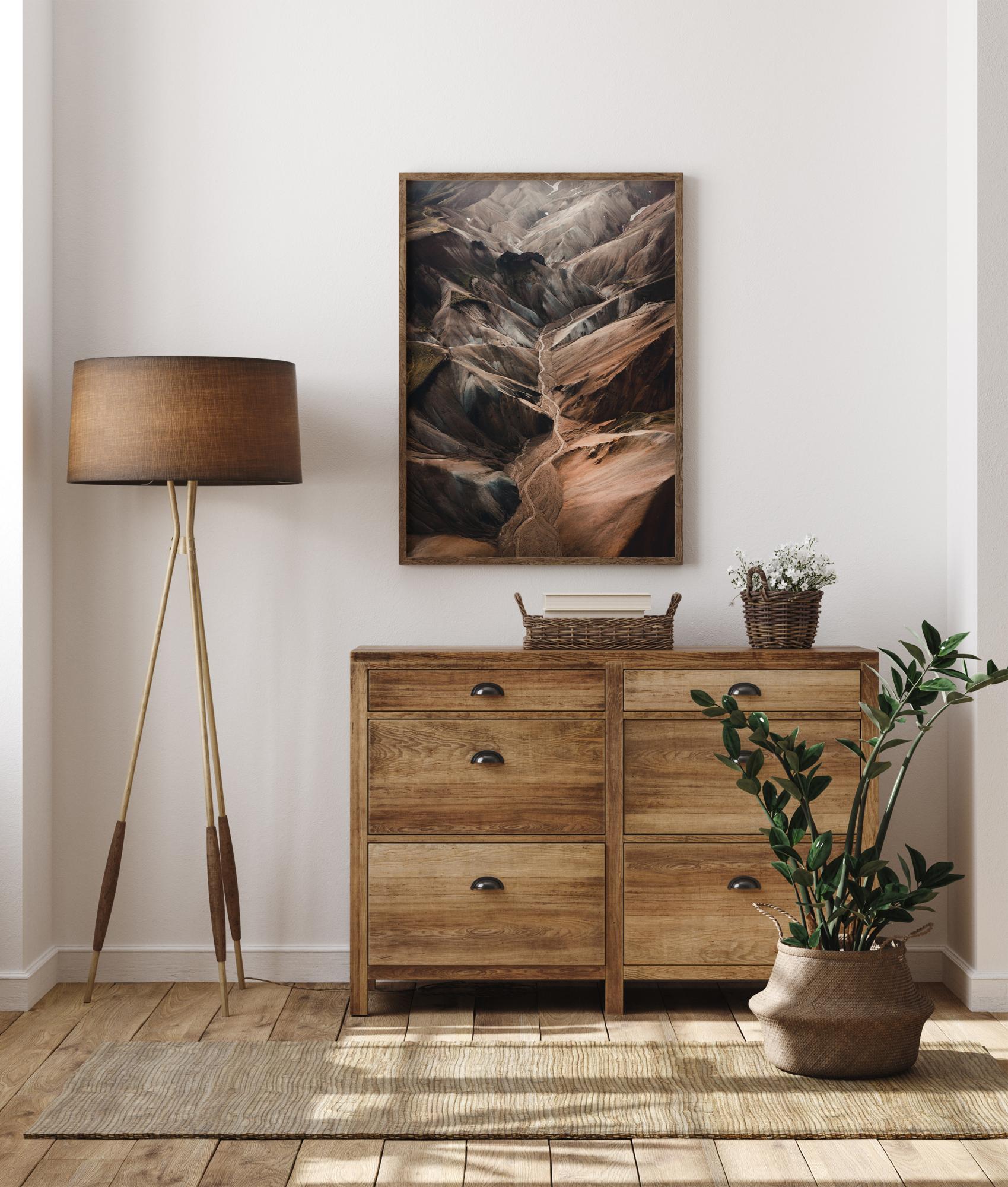 Ein spektakulärer Bergdruck aus der Luft, der die farbenfrohen Berge von Ryholite zeigt. Die sanften, herbstlichen Brauntöne vermitteln ein Gefühl von Wärme und machen dieses Bild zu einem inspirierenden Hingucker in Ihrem Zuhause. Folgen Sie dem einzelnen Pfad und sehen Sie, wohin er Sie auf diesem schönen Naturpfad führt.