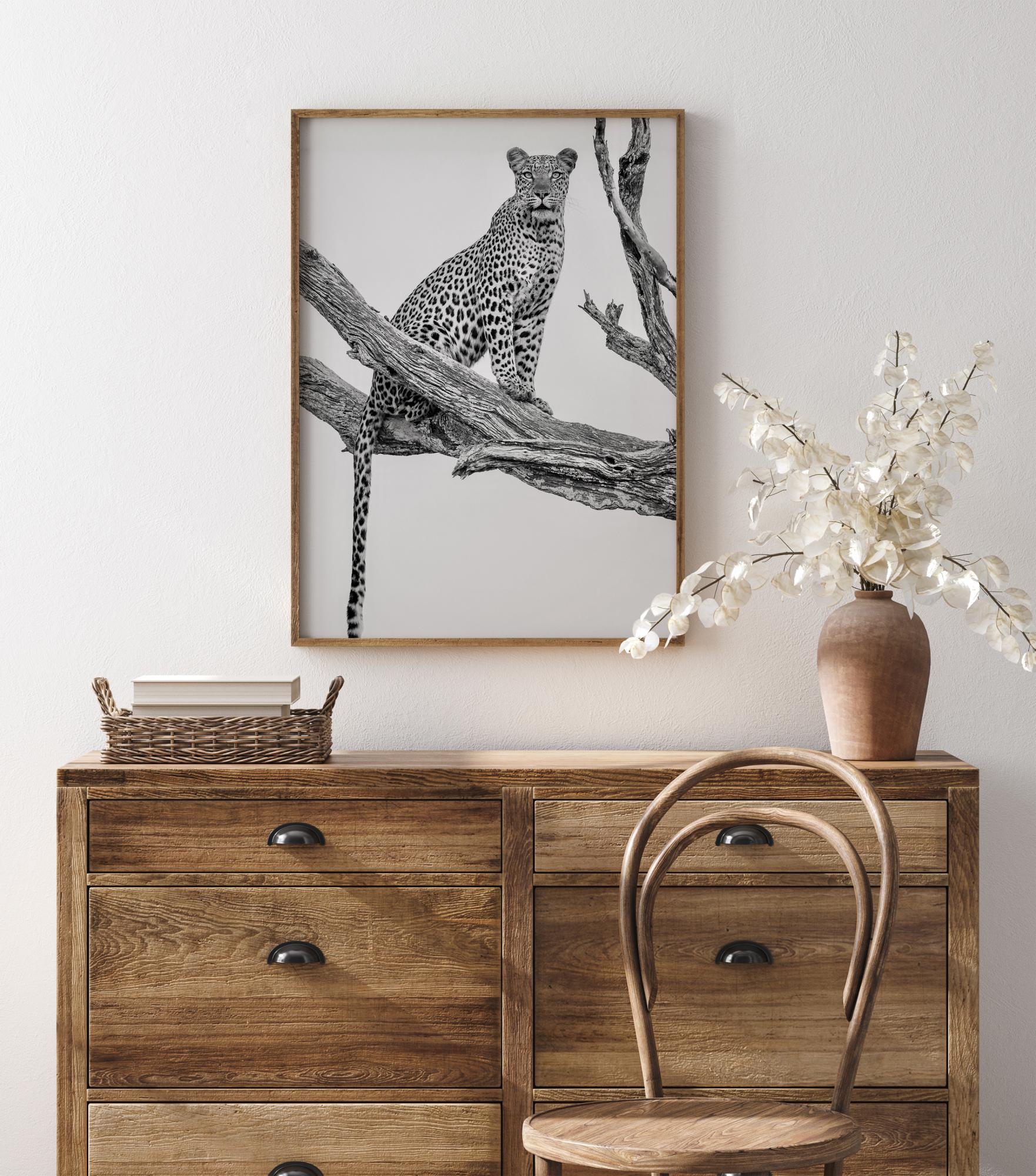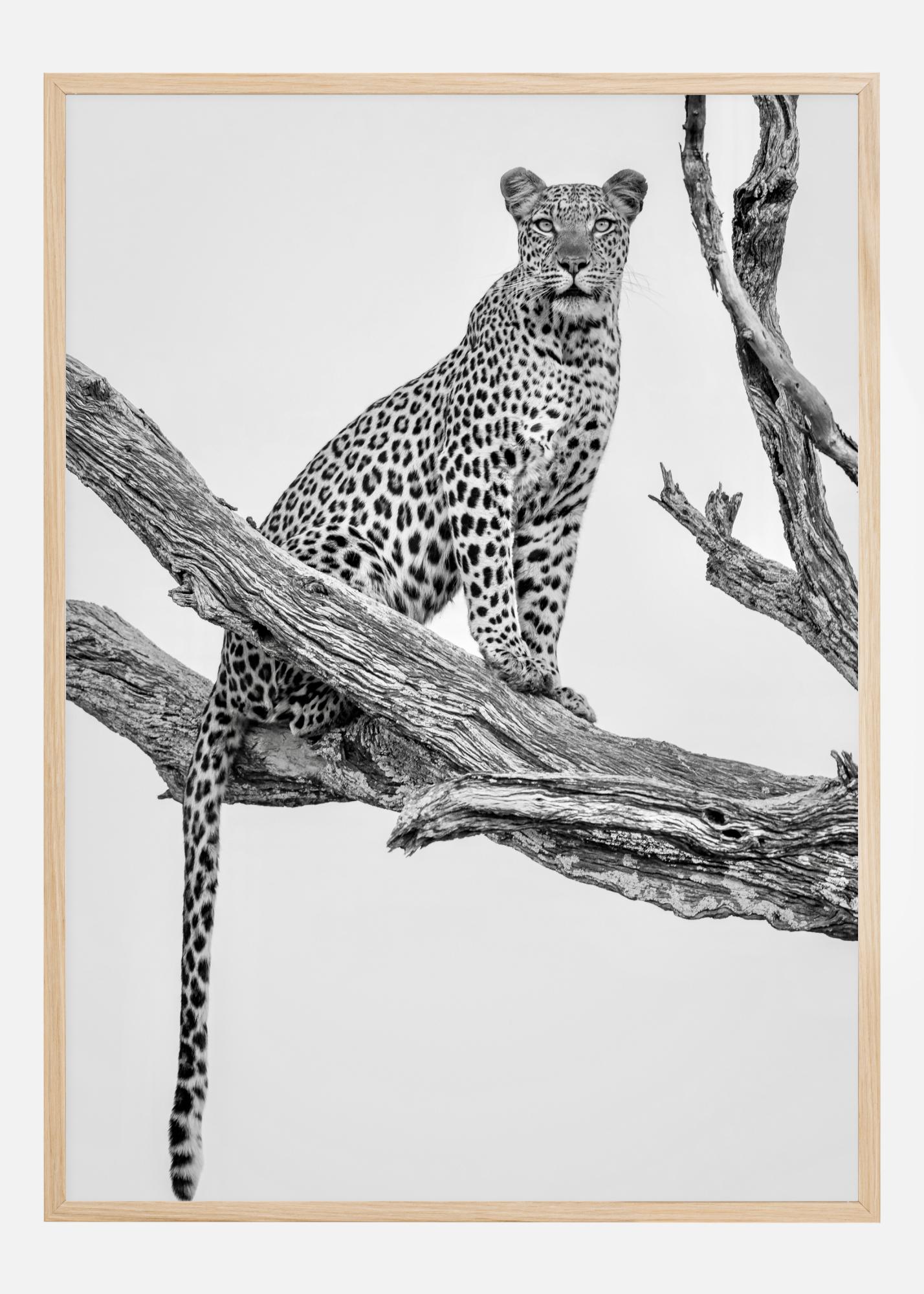 Ein Naturposter mit einem Leoparden, der wachsam auf einem einzelnen Ast sitzt. Der Leopard blickt in die Ferne und vermittelt ein Gefühl von bevorstehenden Geschehnissen. Spüren Sie die Erwartung in diesem Bild.