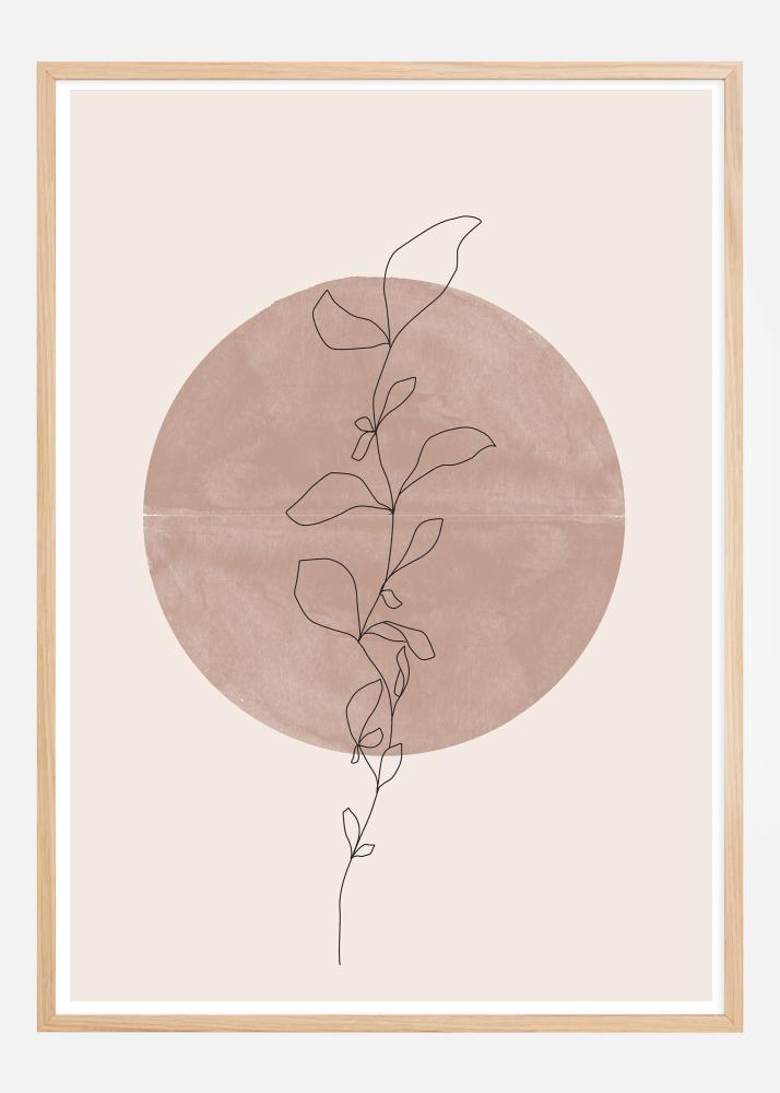 Dieses Poster stellt eine zarte Linienillustration eines blühenden Zweigs dar, dessen Konturen mit einem großen, gemalten Kreis in einem beruhigenden, erdigen Farbton spielen. Der Kontrast zwischen dem minimalen Blumenmotiv und der kraftvollen Hintergrundfarbe schafft eine interessante Dynamik, die sowohl beruhigend als auch ästhetisch ansprechend ist.