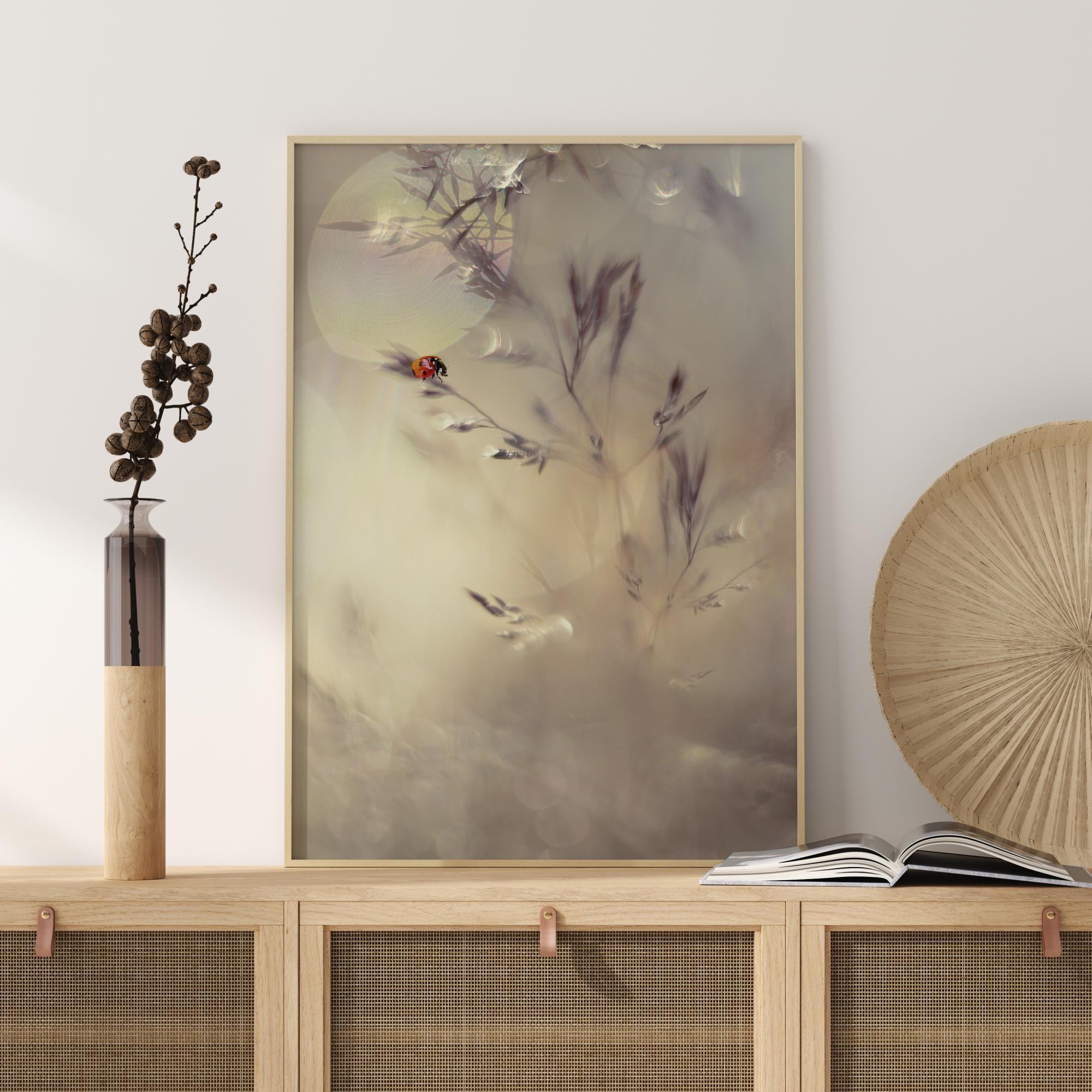 Ein nebliges Bild eines schönen Marienkäfers auf einem getrockneten Grashalm. Durch das sich in der Ferne spiegelnde Sonnenlicht kommen die leuchtenden schwarzen und roten Farben des Marienkäfers besonders gut zur Geltung. Die schönen nebligen Farben vermitteln ein Gefühl von Frieden und Ruhe. Ein schöner Druck für das Schlafzimmer.