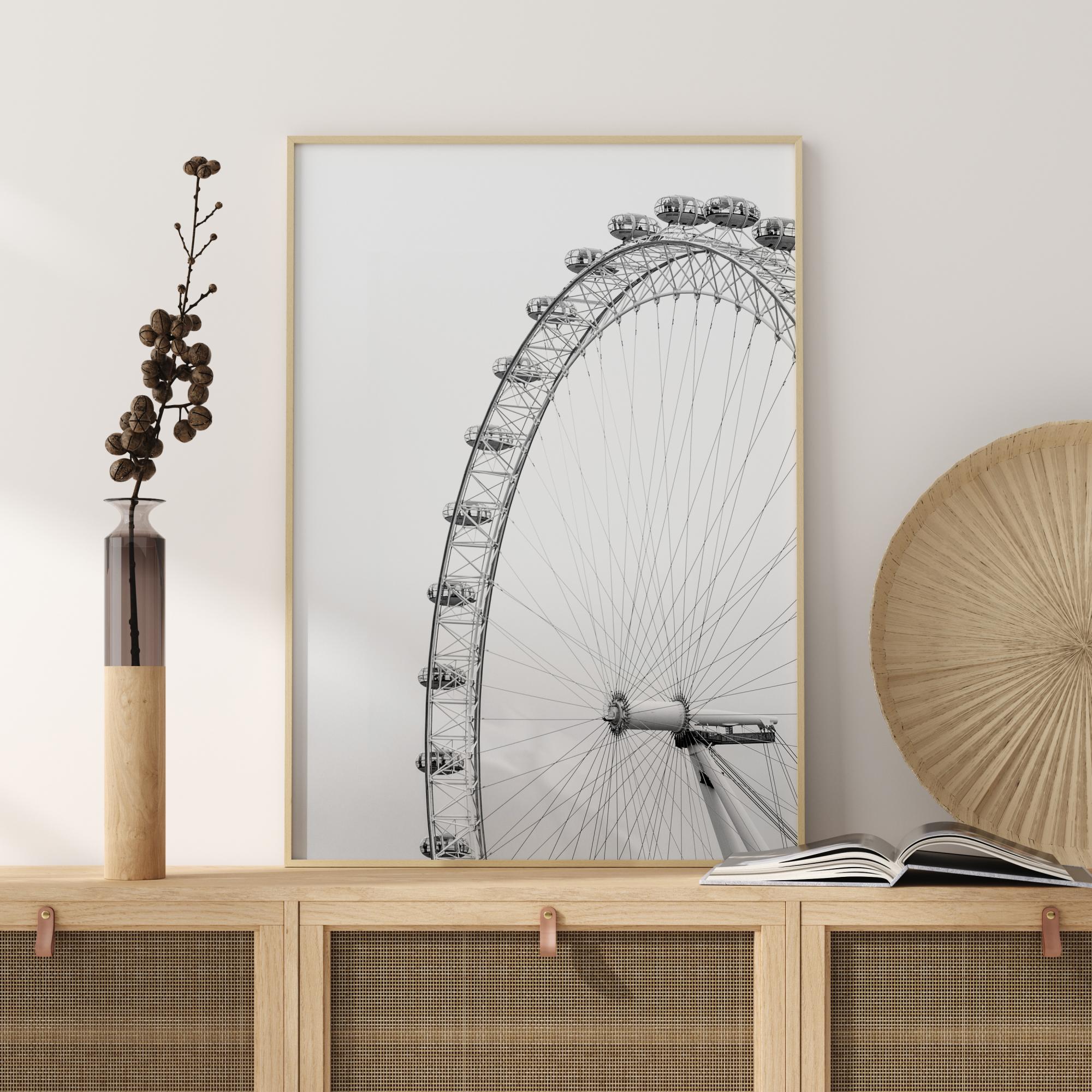 Ein atemberaubender Druck des London Eye. Die graue Skyline und der schwarze Rahmen des London Eye lenken den Blick auf die Passagierkabinen, die auf dem Rand eines Rades stehen. Ein beeindruckender Druck, der die Größe des Rades hervorhebt. Ein wunderschöner Druck, der ein Gefühl der Unendlichkeit vermittelt.