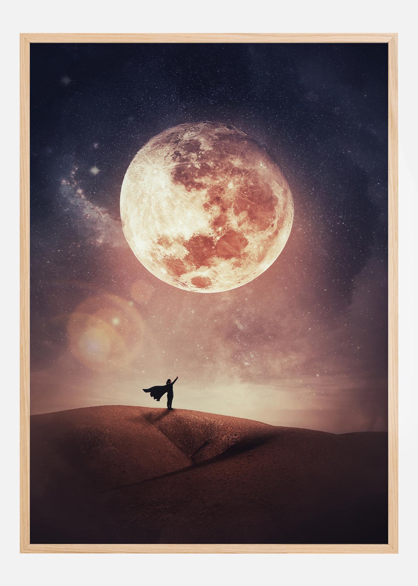 Dieses traumhafte Poster fängt einen magischen Moment ein, in dem eine einsame Figur auf einem Wüstenhügel steht und auf einen gigantischen, strahlenden Mond blickt, der von einem sternbedeckten Himmel umgeben ist. Die Szene ist eine starke Erinnerung an unseren Platz im Universum, sowohl unbedeutend als auch wundersam. Sie weckt Gefühle von Sehnsucht und Neugier, inspiriert uns, groß zu denken und grenzenlos zu träumen.