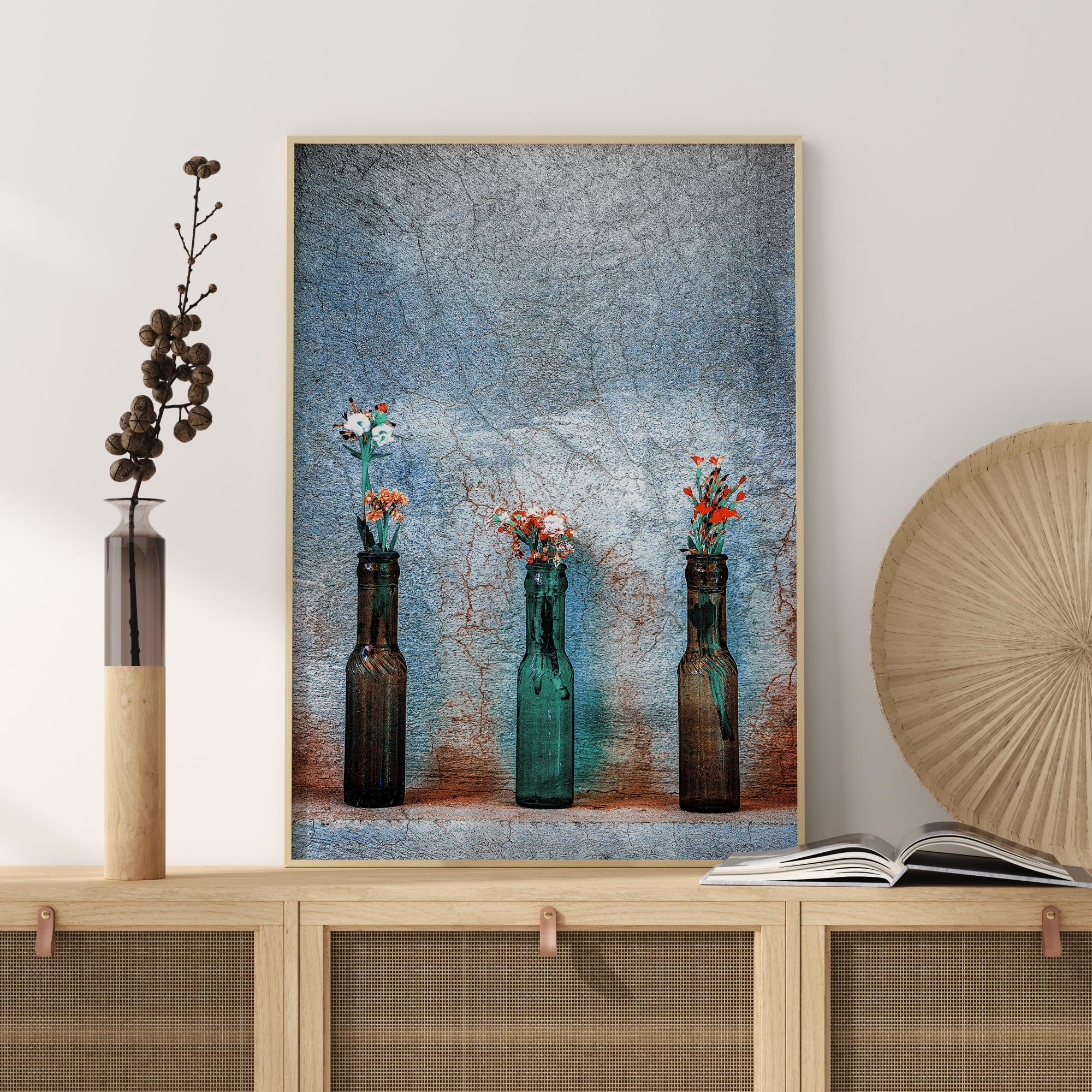 Ein schöner Druck von drei Glasflaschen auf einer Steinoberfläche. Jede Flasche enthält kleine farbenfrohe Sträuße mit bunten Blumen. Die braunen Adern in den Steinen verstärken die braunen Schatten der Flaschen, die sich auf der Steinplatte spiegeln. Ein einfaches, aber zartes Gemälde, das an einer weißen Wand aufgehängt werden kann, um das gewisse Etwas an Farbe hinzuzufügen.