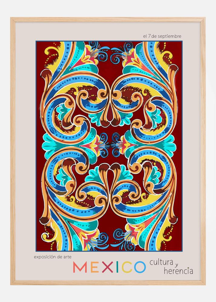 Das Poster ist eine Hommage an Mexikos reiche Kulturlandschaft, und jedes Detail in der Illustration ist sorgfältig gestaltet, um die künstlerischen Traditionen des Landes zu feiern. Der schlichte Eichenrahmen ergänzt die warmen Farben und macht das Kunstwerk zu einer idealen Ergänzung in jedem Raum, der kulturelle Vielfalt und künstlerische Energie schätzt. Dieses Poster ist nicht nur eine Einladung zu einer Kunstausstellung, sondern auch eine Einladung, Mexikos einzigartige Ästhetik und Geist zu erleben und zu schätzen.