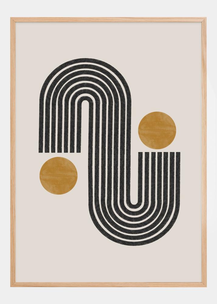 Entdecken Sie eine Welt der stilvollen Schönheit mit unserem Poster, das Kontraste durch Form und Farbe hervorhebt. Dieser Druck zeigt ein dynamisches schwarz-weißes Muster von Linien, die eine sanft geschwungene Form bilden, ausgeglichen mit zwei ockerfarbenen Kreisen, die ein warmes und erdiges Gefühl vermitteln. Dieses minimalistische, aber wirkungsvolle Design ist von der Mid-Century-Modern-Ästhetik inspiriert und bietet ein Gefühl von Ruhe und Ausgewogenheit in jedem Raum, in dem es platziert wird.