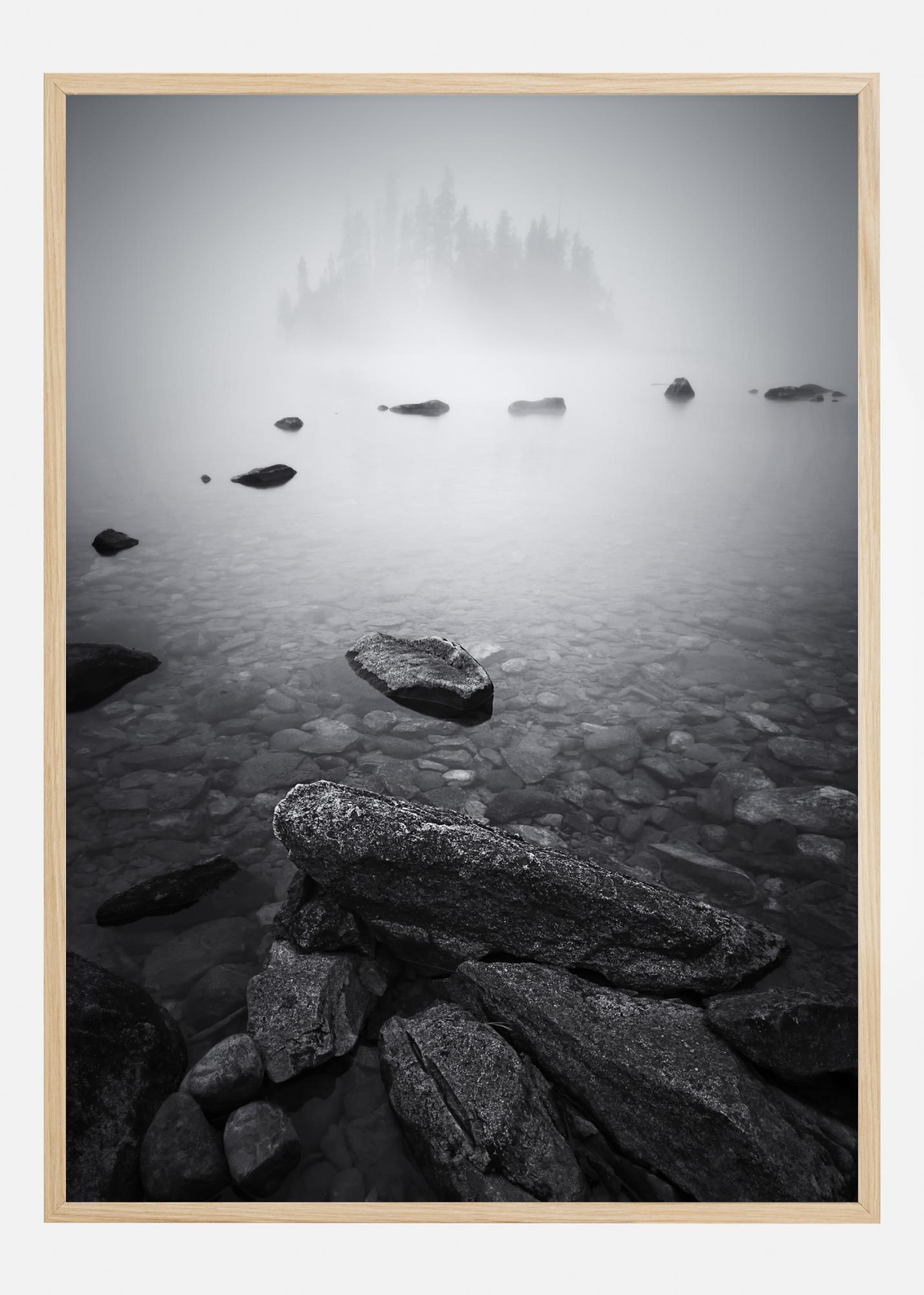 Ein mystisches Naturposter mit Kieselsteinen und einem nebligen See. Stellen Sie sich vor, was dort draußen ist, während Sie auf die nebelverhangene, baumbewachsene Insel blicken. Verleihen Sie Ihrem Zuhause mit diesem atemberaubenden Druck auf einer blauen Wand eine magische Atmosphäre.