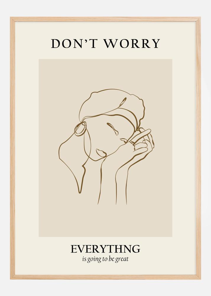 Dieses künstlerische Poster fängt einen ruhigen Moment der Reflexion und inneren Frieden durch eine Linienzeichnung einer Person ein, die ihre Hand gegen das Gesicht hält. Der Text "DON'T WORRY" in großen Buchstaben geht über das Bild hinaus und bietet eine beruhigende Erinnerung, während "EVERYTHING is going to be great" die Botschaft mit einem nachdenklicheren Ton unterstreicht. Dieses moderne Kunstwerk ist perfekt, um ein Gefühl von Ruhe und Optimismus im Zuhause oder im Büro zu schaffen.