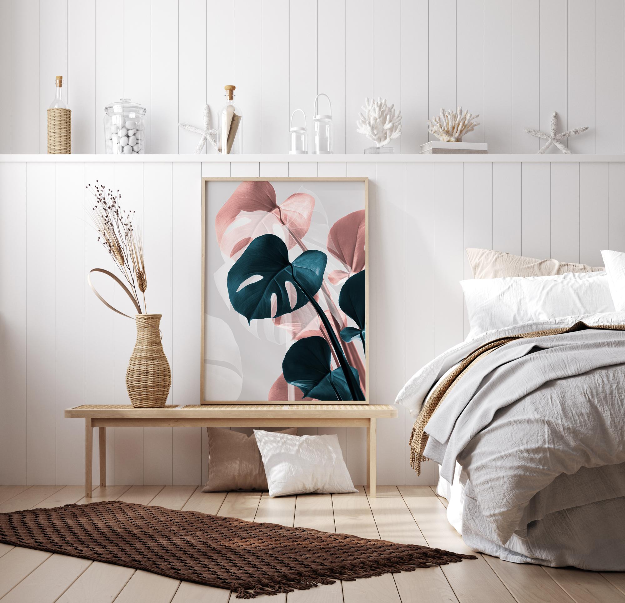 Ein wunderschönes Bild von rosafarbenen und dunkelgrünen Monstera-Blättern, das die makellose Kreativität ihrer Blätter zeigt. Auf einem beigefarbenen Hintergrund leuchten die herzförmigen Blätter mit ihren schönen grünen und rosafarbenen Blättern. Die gefiederten Strukturen bringen ein aufregendes Gefühl in Ihr Zuhause.