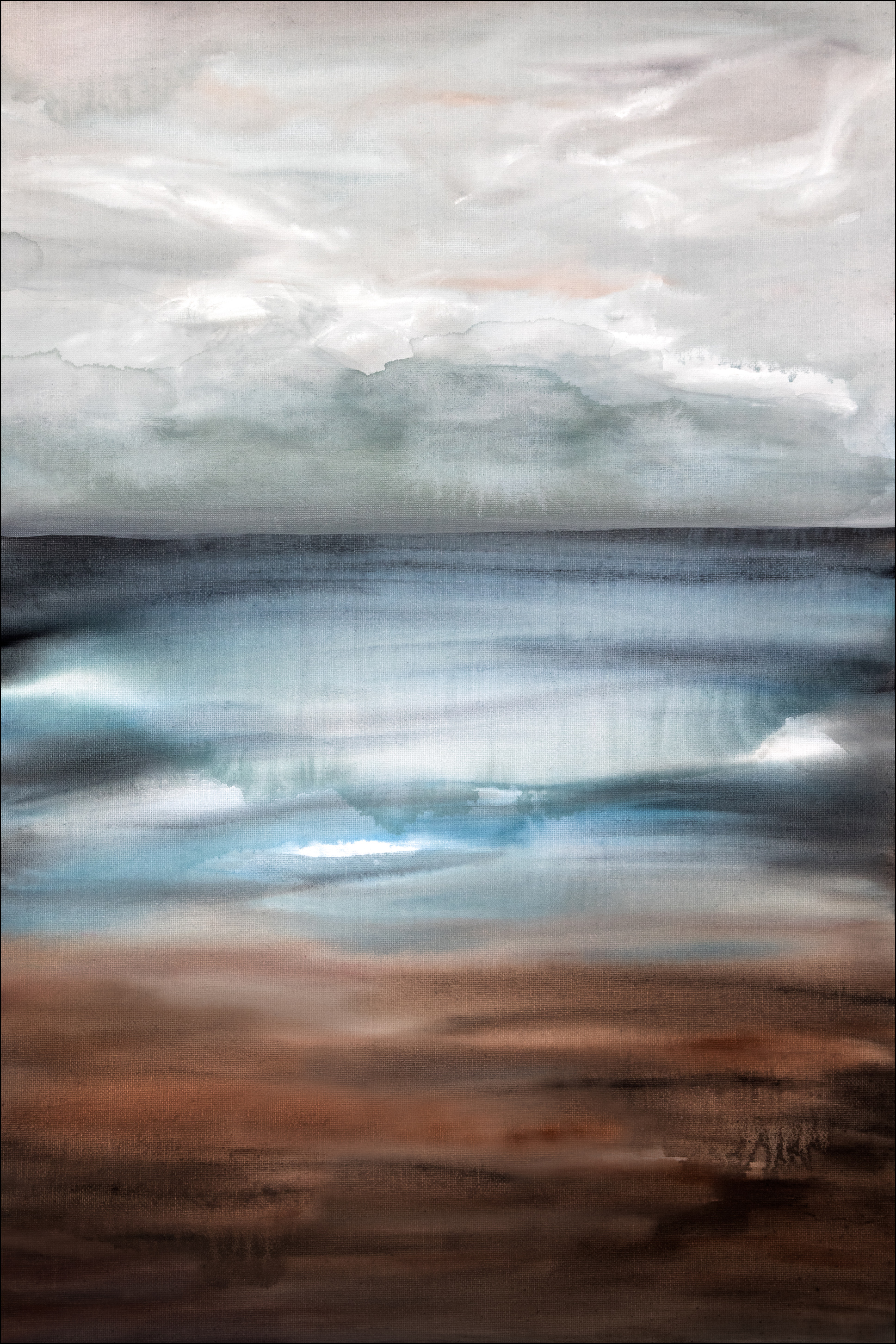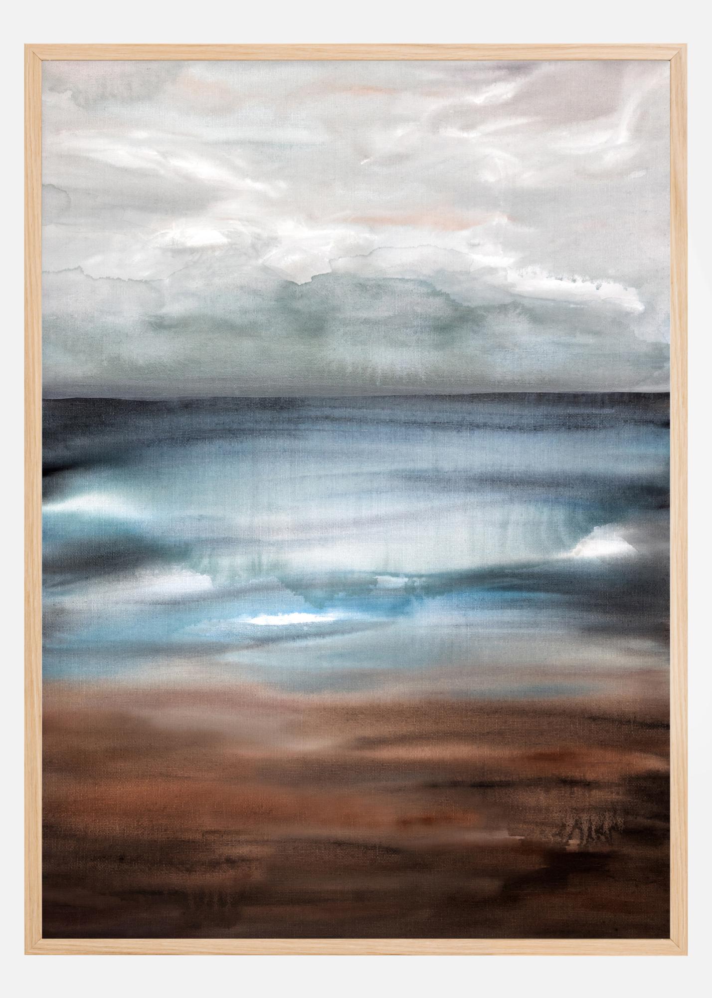 Eine entspannende Darstellung eines neuen Tages. Die sanften Pastellfarben zeigen den bewölkten Morgen mit dem Nebel über dem Meer. Der Horizont verschmilzt perfekt mit den grauen und weißen Wolken. Mit diesem entspannenden und beruhigenden Druck an der Wand kann man fast das Meer hören.