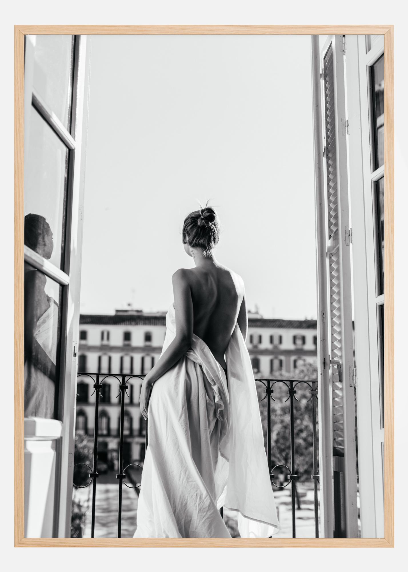 Eine sexy schwarz-weiße Nahaufnahme einer Frau mit weißem Handtuch, die auf einem Balkon steht. Mit ihrem zu einem Dutt gebundenen Haar scheint die Frau die Aussicht zu bewundern. Die Spiegelung der Frau im Fenster sorgt für ein sinnliches Bild. Ein sinnlicher und doch schöner Druck, der an Ihrer Schlafzimmerwand hängen sollte.