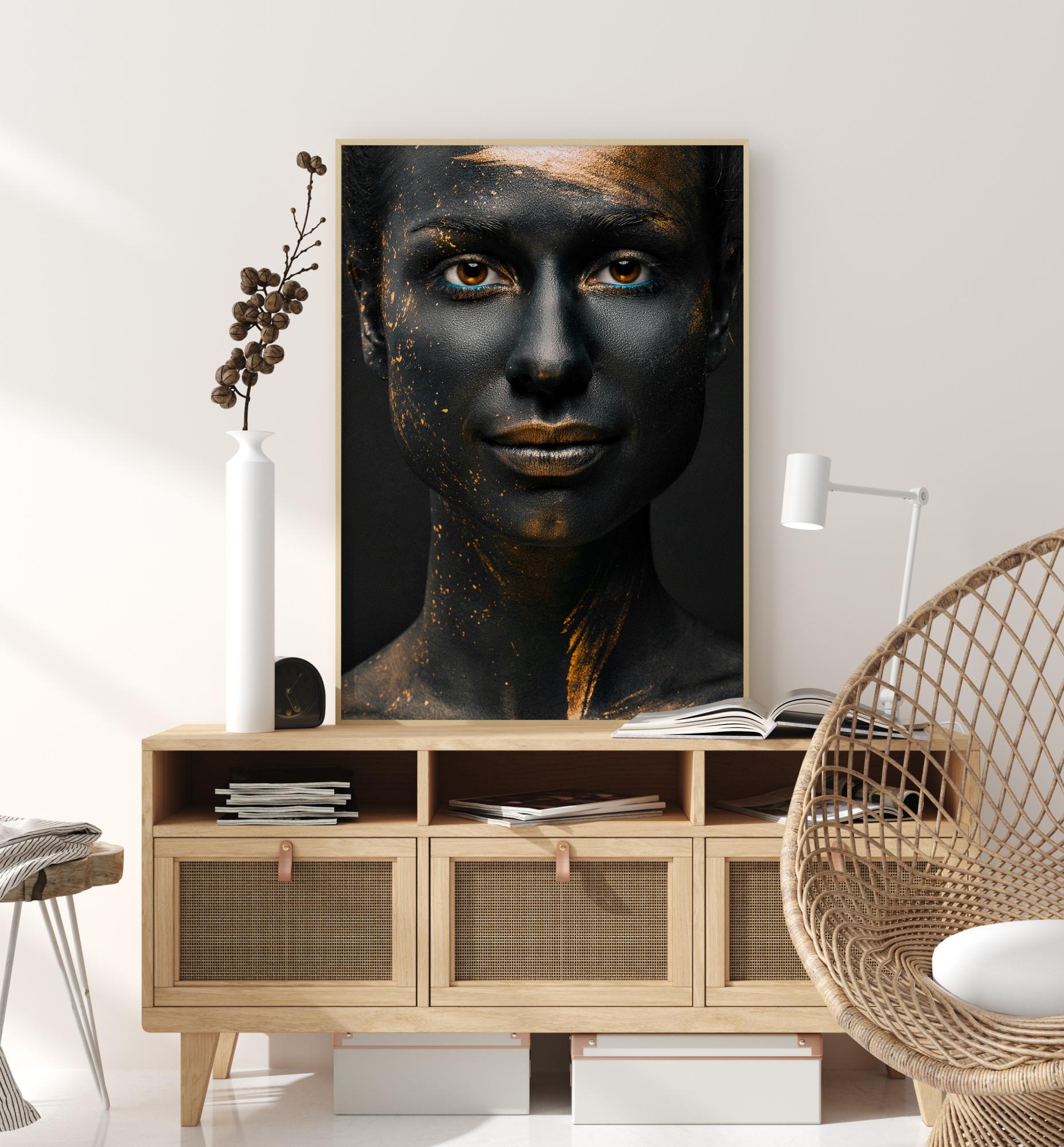 Ein Schwarz-auf-Schwarz-Porträt einer lächelnden Dame mit grau bemaltem Gesicht. Das Gesicht der Frau wurde mit goldener Farbe auf Stirn, Lippen und Hals bespritzt. Die Augen der Frau, die direkt in die Kamera blickt, wurden mit blauem Eyeliner hervorgehoben, was ihr einen intensiven Blick verleiht. Dieser wunderschöne Druck zeigt ein Bild von perfekter Schönheit, das Ihr Zuhause erhellen wird.
