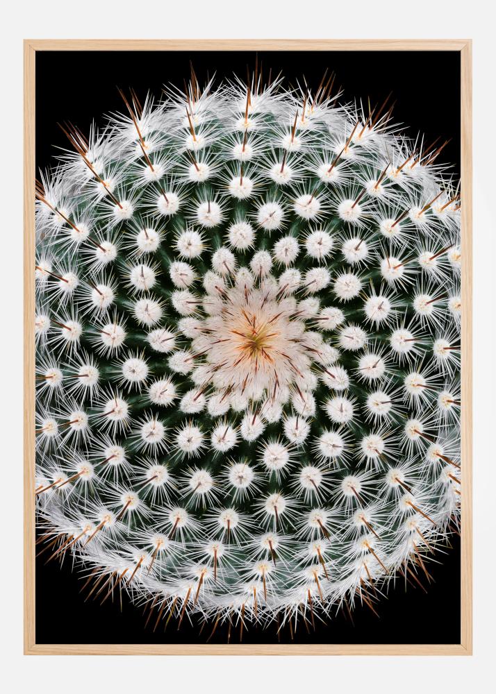Eine Luftaufnahme eines Kaktus mit weißen Blüten. Auf schwarzem Hintergrund hebt das dunkle Grün die weißen Blüten und die stacheligen Stacheln hervor. Der mittlere Teil der Pflanze hat einen leichten Gelbton, der dem Bild einen zusätzlichen Farbtupfer verleiht. Ein idealer Druck für jeden, der Pflanzen liebt.