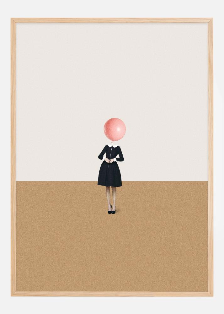Dieses künstlerische Poster fesselt den Blick mit seinem einfachen, aber kraftvollen Bild einer Frau, die ein schwarzes Kleid trägt und alleine vor einem Hintergrund warmer Sandtöne steht. Sie hält eine perfekt kugelförmige, rosa Blase über ihrem Kopf, was einen visuellen und nachdenklichen Kontrast zwischen der Person und der umgebenden Fläche schafft.