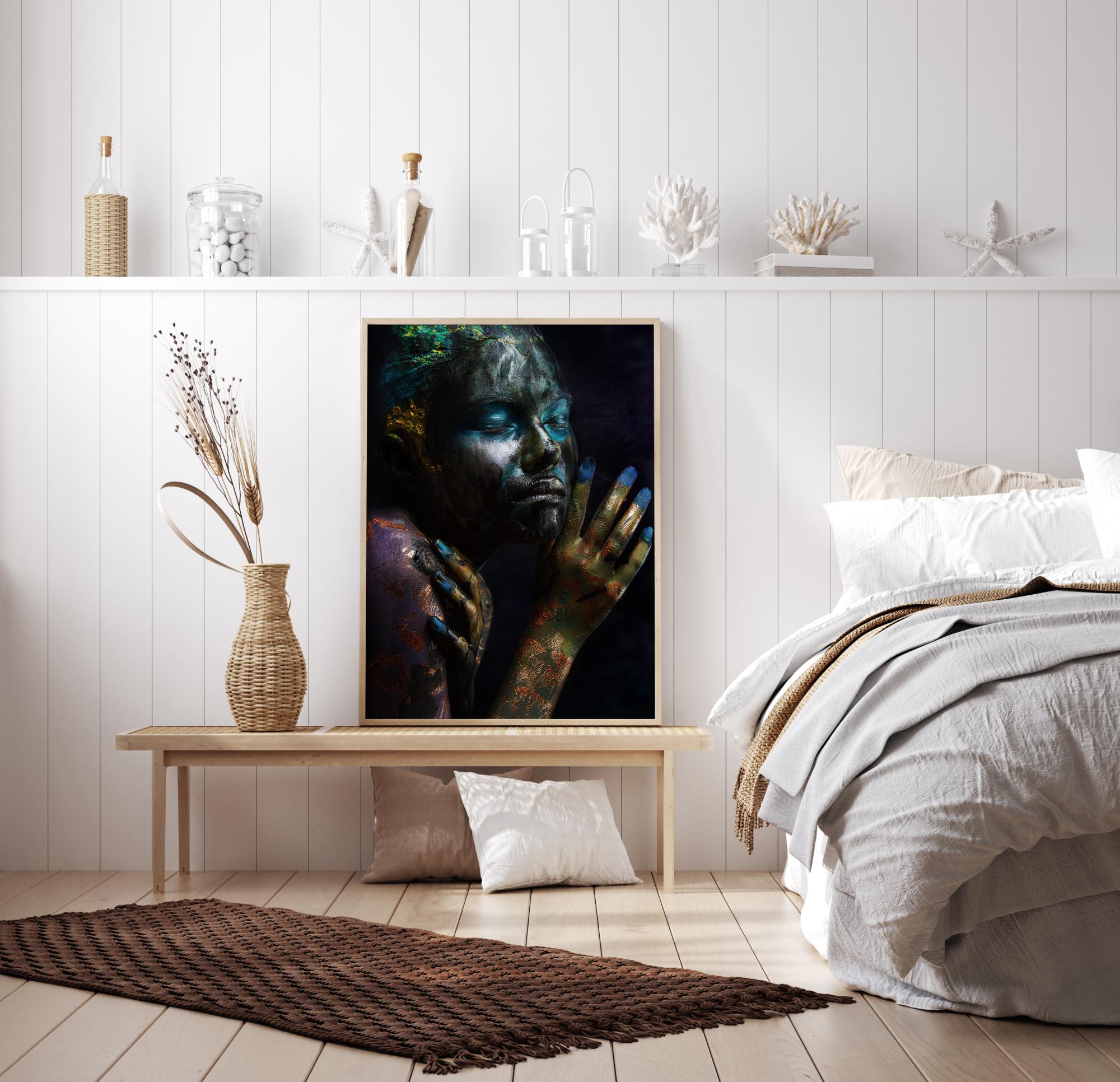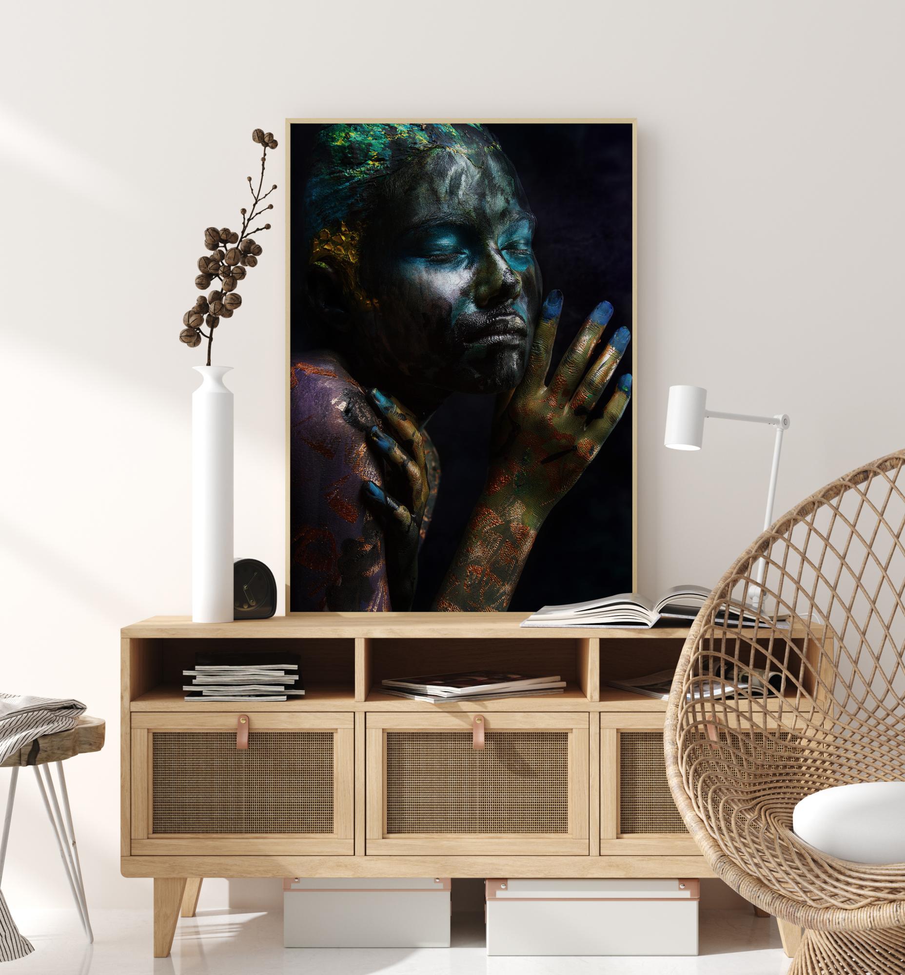 Ein atemberaubender Druck einer Frau, die mit Farbe bedeckt ist. Auf schwarzem Hintergrund ist die Frau mit bunten Farben bedeckt. Durch das natürliche Licht, das auf das Gesicht und die Schultern der Frau scheint, wird die Intensität der Farben hervorgehoben. Ein schöner Druck, der einer weißen Wand Farbe verleiht.