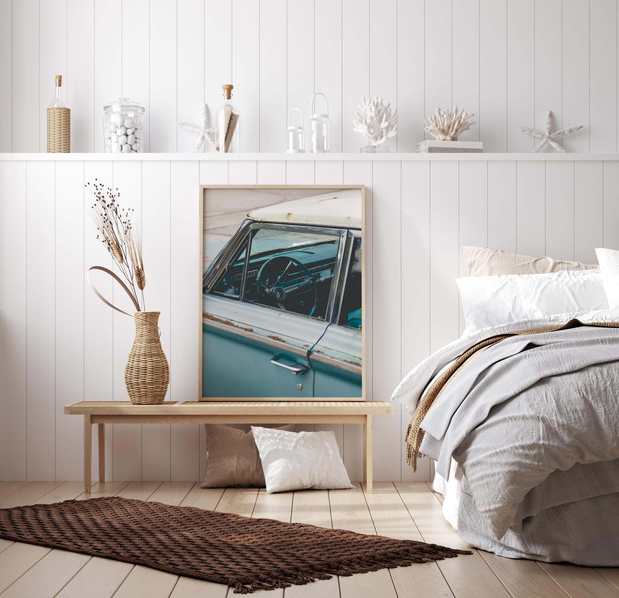 Eine erstaunliche Nahaufnahme eines verrosteten alten Autos mit einem alten Lenkrad und einem Tachometer. Das hellblaue Automodell versetzt uns in die 1950er Jahre mit den coolsten Autodesigns zurück. Ein perfekter Druck zum Aufhängen in einer Umgebung im Vintage-Stil.