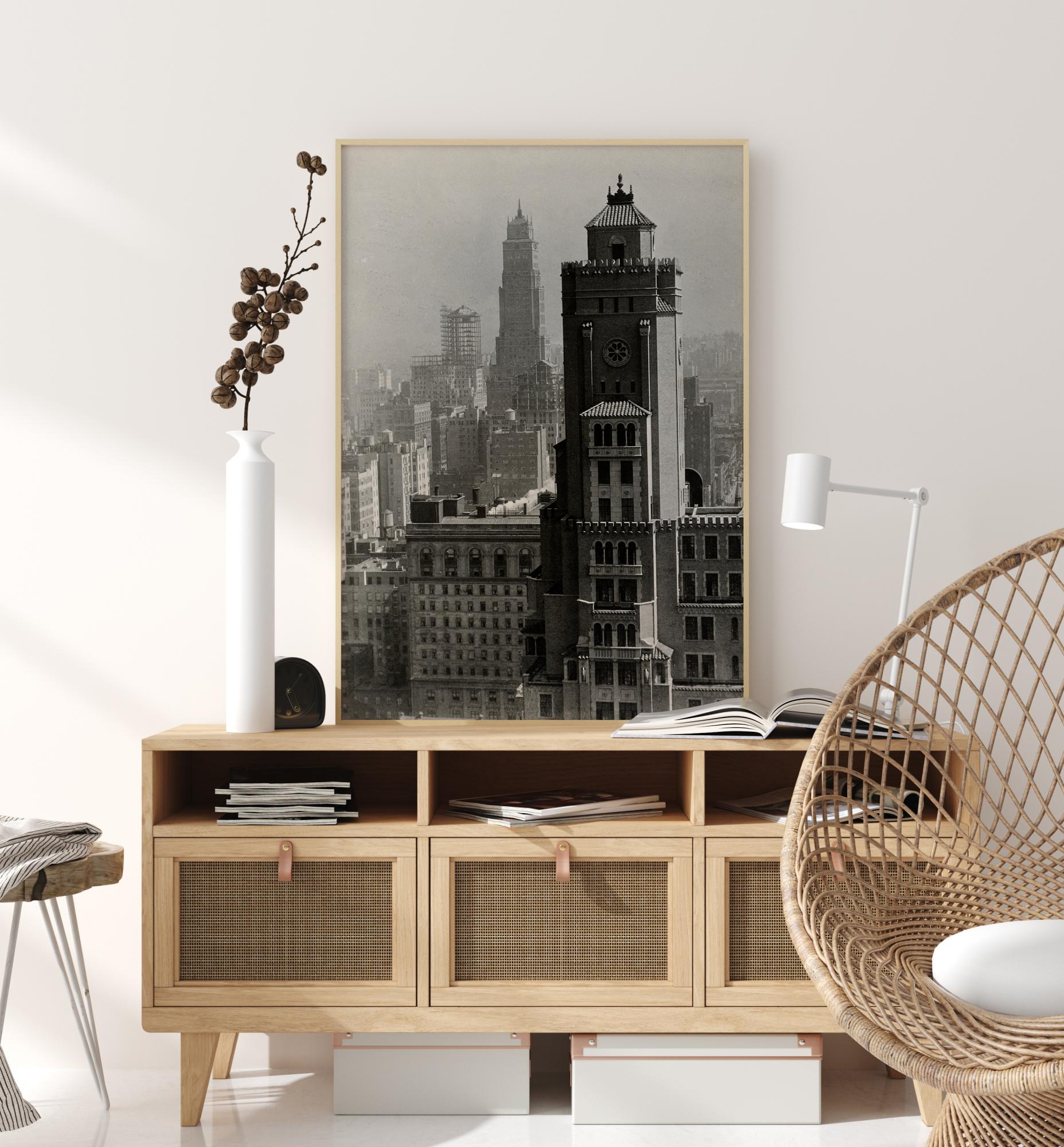 Ein Schwarz-Weiß-Druck einer alten Stadt. Die graue Skyline fügt sich perfekt in die ebenfalls grauen Gebäude ein. Die Stadt besteht aus Gebäuden unterschiedlicher Höhe. Im Vordergrund scheint das natürliche Licht direkt auf die Ostseite des Hauptgebäudes. Hängen Sie diesen Druck in Ihrem Arbeitszimmer auf und beobachten Sie die Altstadt.