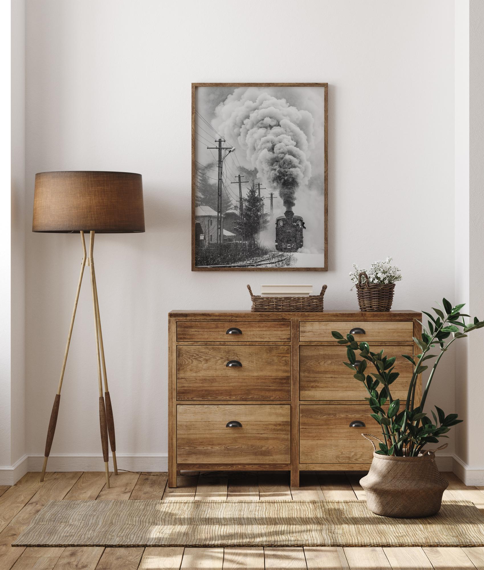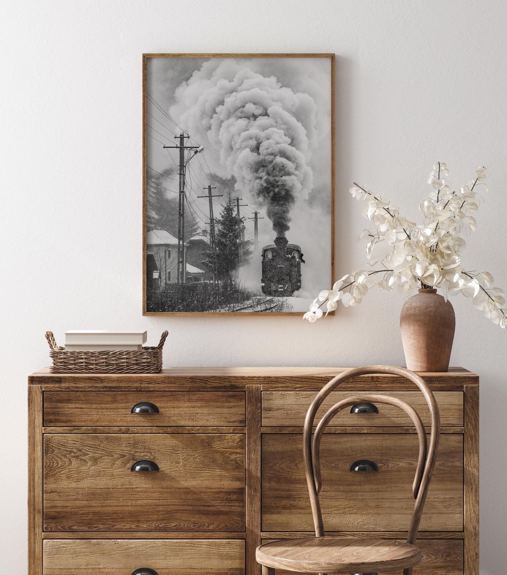 Ein dramatisches Poster mit einer Dampflok im Schnee. Lassen Sie sich von der epischen Natur dieser Aufnahme einfangen, wenn der Rauch in die Höhe steigt. Holen Sie sich diese weihnachtliche Stimmung in Ihr Zuhause.