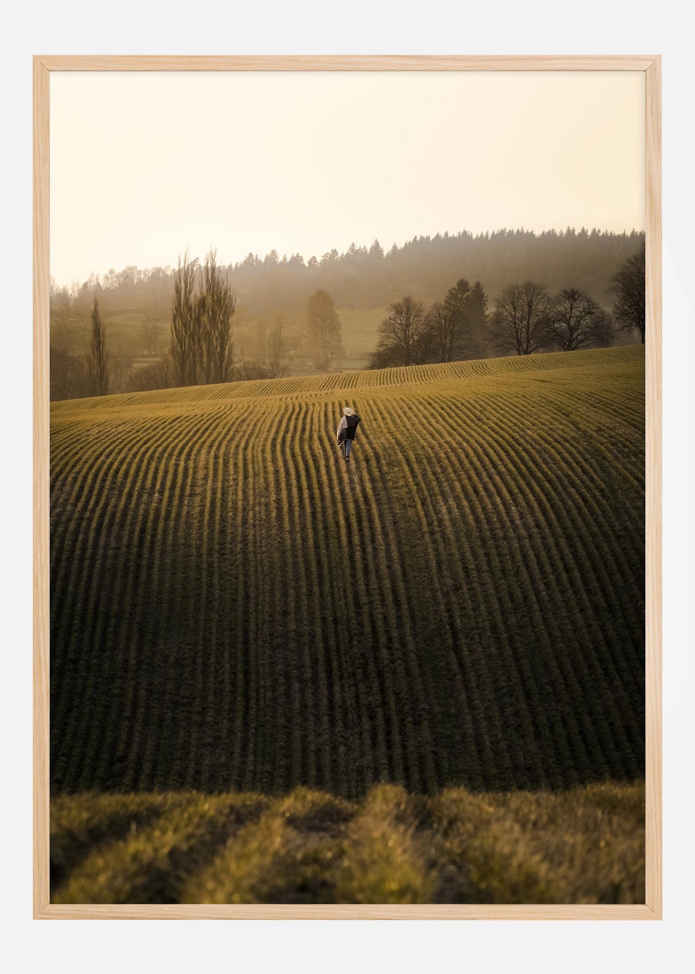 Dieses Poster fängt die Essenz der ländlichen Idylle in einem Moment der Ruhe und Einfachheit ein. Eine einsame Gestalt wandert entlang der symmetrischen Streifen eines Anbaufeldes, eingebettet in eine weiche goldene Stunde, in der der Sonnenuntergang sein warmes Licht über die Landschaft wirft. Dieses Bild bietet eine Meditation über den Rhythmus des Lebens und die wechselnde Schönheit der Natur und lädt den Betrachter ein, auf einen stillen Spaziergang durch das Feld mitzukommen.