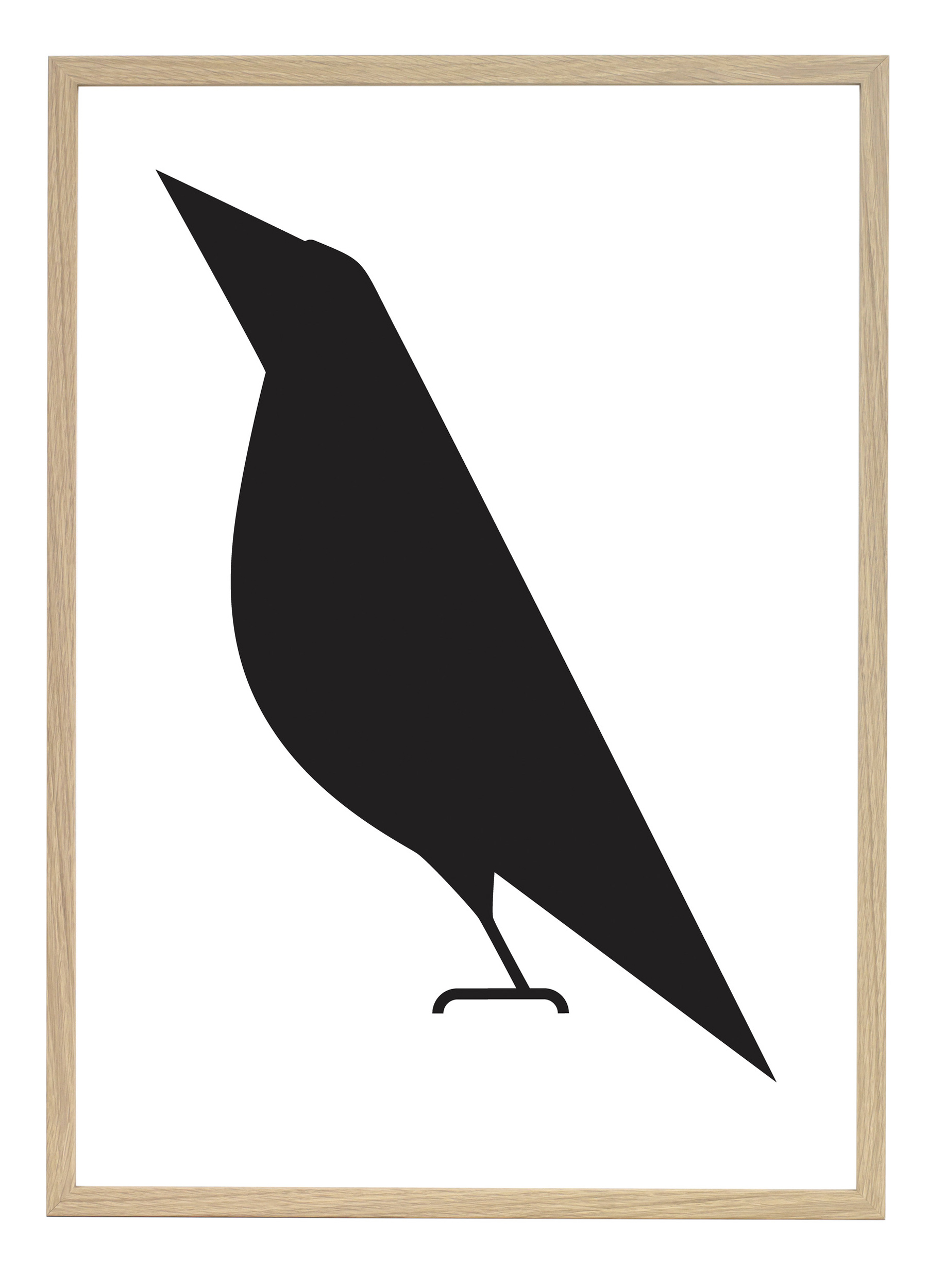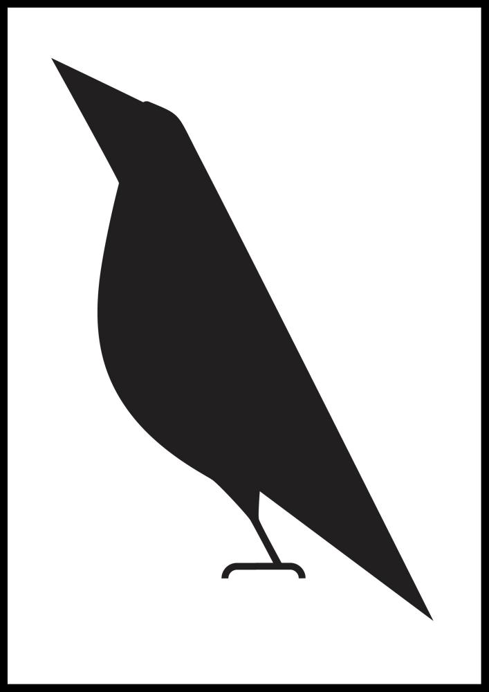 Ein grafischer Druck mit einer stilisierten Illustration einer Krähe, die den Schnabel in den Wind hält. Die einfache, schwarze Form des Vogels auf einem weißen Hintergrund passt in jede Einrichtung, vom Kinderzimmer bis hin zum Warteraum in einer Zahnarztpraxis. Das Poster kommt am besten in einem einfarbigen Rahmen oder an einem Posteraufhänger zur Geltung, idealerweise mit anderen schwarz-weißen Motiven und grafischen Drucken.