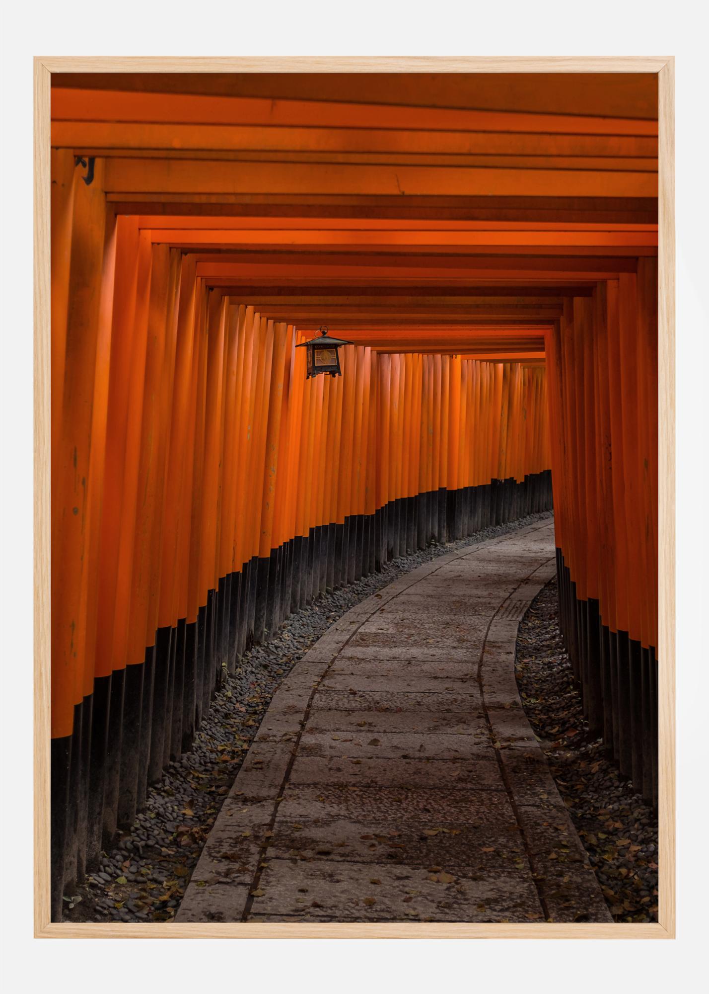 Ein Porträt eines steinernen Weges, gesäumt von orangefarbenen und schwarzen Holzbohnen. In der Mitte des Weges hängt eine Eisenlaterne. Das natürliche Licht scheint auf den Weg, auf den einige kleine Herbstblätter gefallen sind. Ein schöner Druck, der jede Wand erhellt.