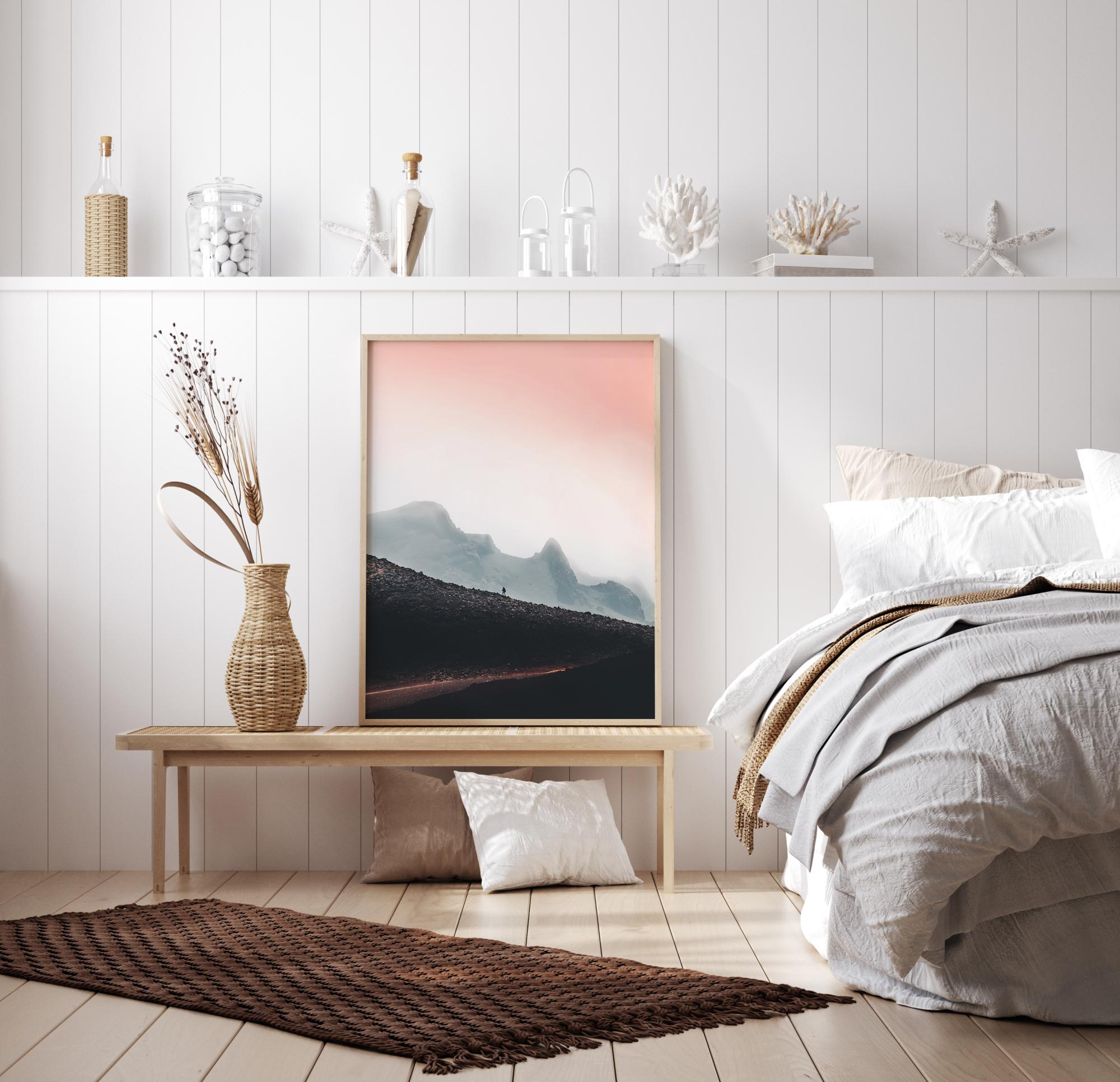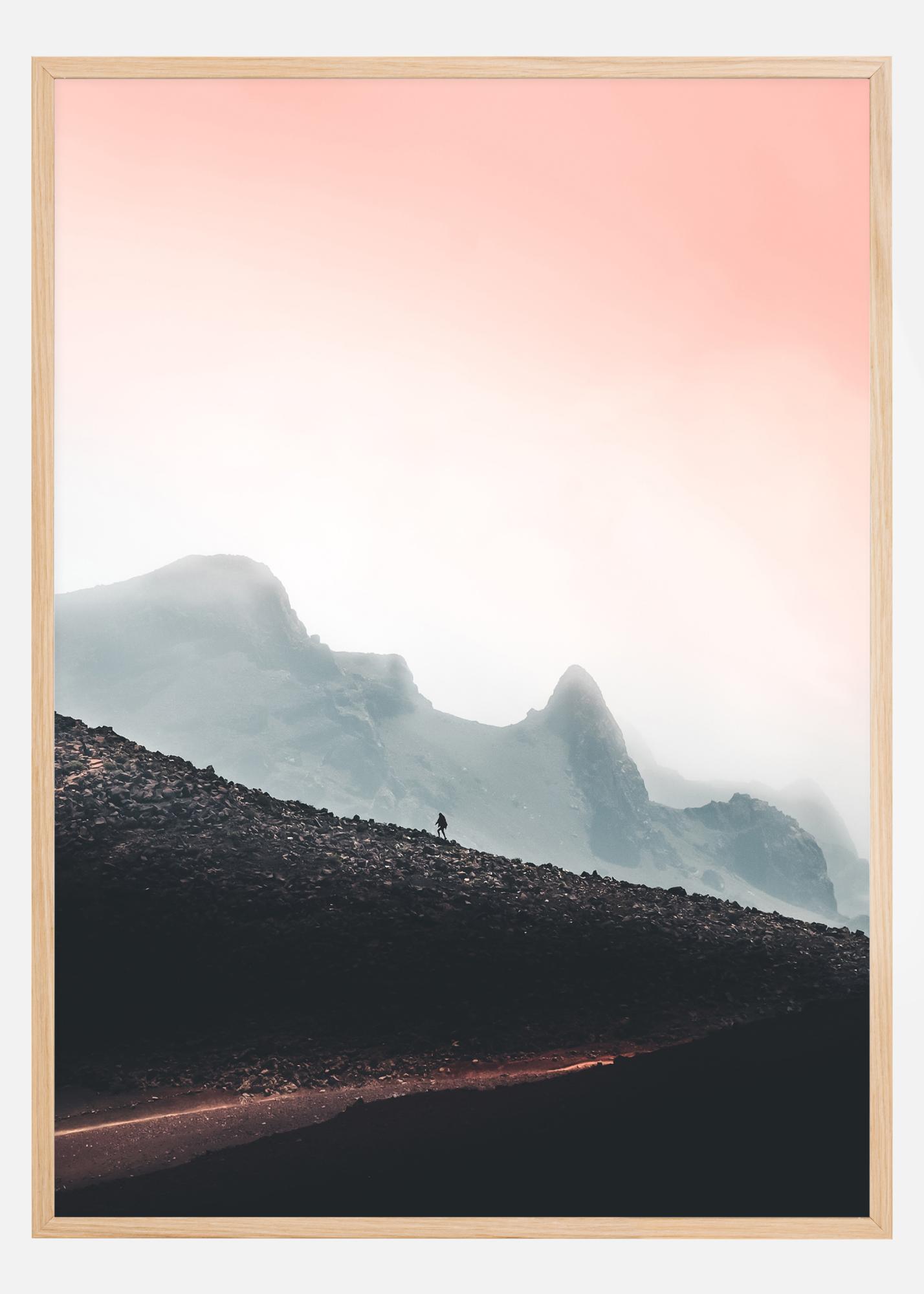 Ein nebliger Farbdruck einer Landschaft. Mit dem pfirsichfarbenen Himmel im Hintergrund kann man eine entfernte Figur sehen, die den Hügel hinaufsteigt. Im Vordergrund schneidet ein kleiner Weg durch die Hügel. Ein perfekter Druck für alle, die die freie Natur lieben.