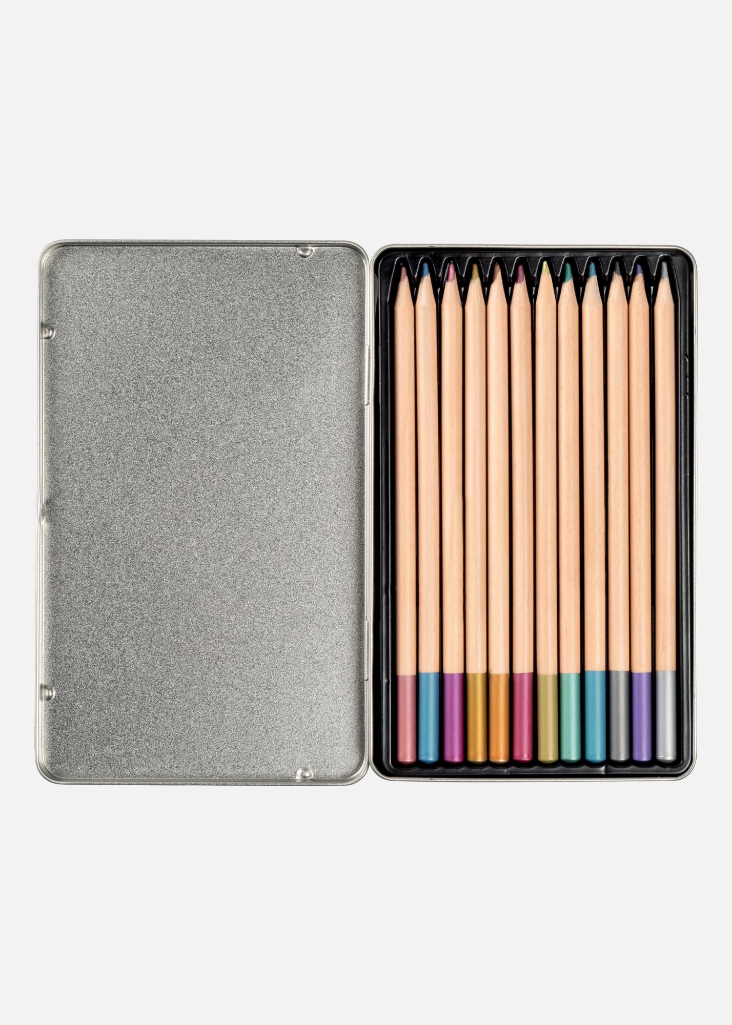 PAC Stift Set Metallic enthält 12 metallische Farbstifte, die auf sowohl hellen als auch dunklen Papieren einen eleganten und schimmernden Effekt erzeugen. Perfekt für Scrapbooking, Fotoalben und kreative Projekte. Das Set umfasst die Farben Gold, Silber, Kupfer, Rosa, Rot, Lila, Blau, Hellblau, Grün, Hellgrün, Braun und Schwarz.