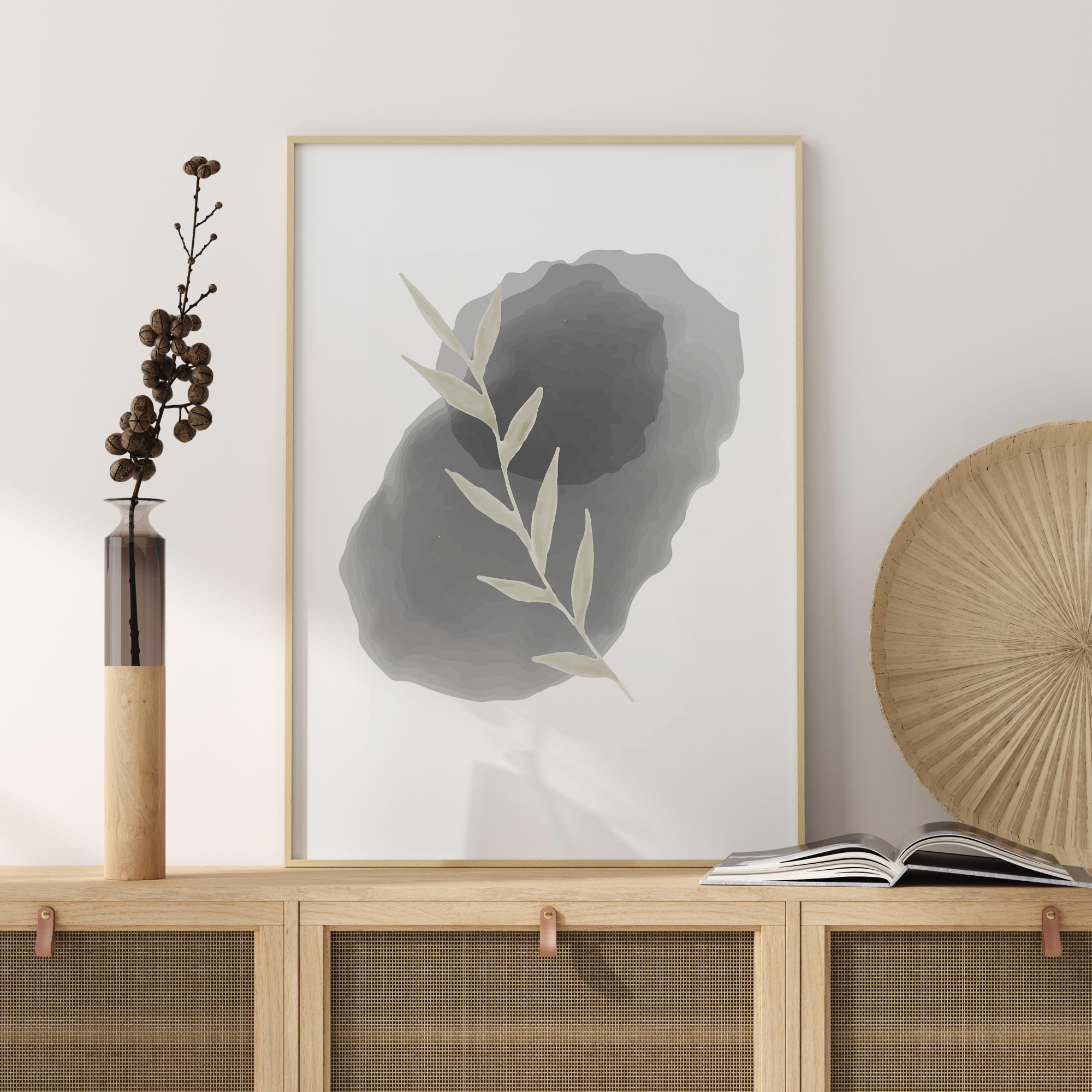 Ein einfacher Druck eines beigefarbenen Blattes, das auf einem ovalen Stein liegt. Auf weißem Hintergrund sitzt das Blatt auf zwei verschiedenen Steinen: einem kleinen schwarzen Stein, der auf einem größeren beigefarbenen Stein liegt. Bringen Sie mit diesem Bild einen Hauch von Zartheit in Ihr Zuhause.