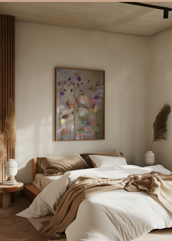 Ein wunderschöner handgemalter Druck mit lila und weißen Trockenblumen. Auf einem beigefarbenen Hintergrund schaffen die natürlichen Farben der Blumen eine entspannende Atmosphäre. Die sanften Grün-, Violett- und Orangetöne sind sehr angenehm für das Auge. Ein schöner Druck, den Sie neben Ihrem Schminktisch aufhängen können.