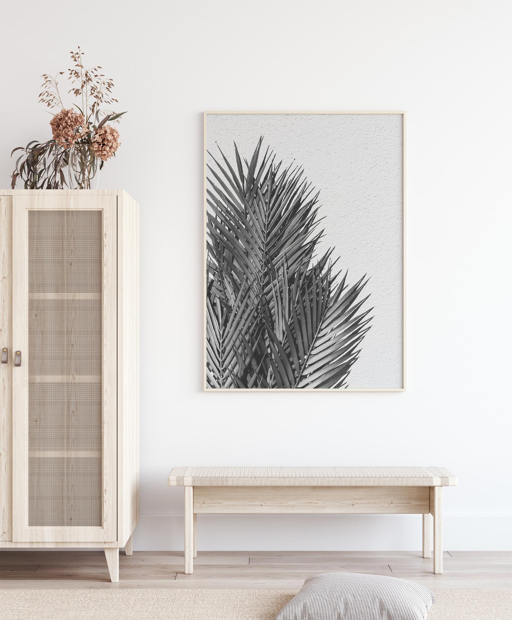 Ein schwarz-weißes Porträt von Palmenblättern, die an einer rauen weißen Wand lehnen. Die raue Wand hebt die übereinander angeordneten Palmblätter hervor. Auf der linken Seite des Bildes kann man fast die Hitze spüren, die auf die Blätter niederprasselt. Bringen Sie dieses Bild in Ihr Sommerhaus, um eine tropische Atmosphäre zu schaffen.